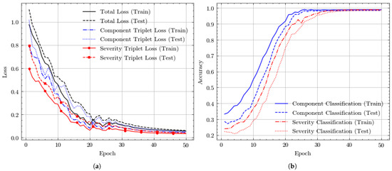 To validate the efficacy of the proposed structured latent-space learning approach, an ablation study was conducted. This study compared the full framework (AS-LSLF) with a baseline two-dimensional convolutional autoencoder (2D-CAE) trained only with the standard reconstruction loss, combined with a classification network for both component and severity classifications. The experiments were performed on a PC with an Intel Core Ultra 7265 K processor (Santa Clara, CA, USA), 128 GB of RAM, and an NVIDIA RTX 5090 GPU (Santa Clara, CA, USA). This setup used Python 3.11 (Wilmington, DE, USA) and Pytorch 2.8.0 (New York City, NY, USA) to facilitate the best utilization of the latest software capabilities and GPU acceleration. The hyper-parameters for each model were optimized using grid search optimization. The hyper-parameters for grid search optimization included the learning rate, the number of layers, filter sizes, and regularization terms, as shown in Table 2. Following this search, the optimal parameters for the final model were a latent dimension size of 256, a learning rate of , a weight decay of , a reconstruction weight of , a component triplet weight of , a severity triplet weight of , a triplet margin of , and a classification weight of . The models were trained for a maximum of 50 epochs, with a batch size of 16. To prevent overfitting and determine the optimal training duration, an early stopping mechanism was employed with a patience of 7 epochs, monitoring the validation loss. The dataset was shuffled and split into a 70:30 train–test split and was stratified to maintain class proportions across all sets. Figure 5 illustrates the training loss and accuracy of the proposed AS-LSLF model. The loss curve demonstrates stable convergence of the combined objective function, with the multi-task learning approach effectively balancing the reconstruction quality and latent space structuring.