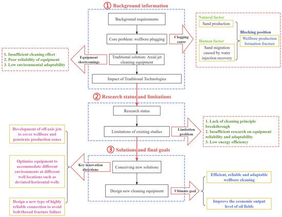 In order to solve the above problems, domestic and foreign scholars have conducted research and designed methods to solve this. Huang [16] et al. designed a calculation model for a hydrogen-blending natural gas pipeline package and determined that the change in throughput has a direct relationship with the pipeline pressure, thus affecting the structural design of the fluid pipeline and cleaning equipment. Therefore, it can be concluded that adjusting reserves by changing the inlet pressure is effective. Shao [17] et al. developed a circulating well washing device and formulated matching technology to solve the problems of a high pump inspection operation ratio caused by coal dust and sand deposition, which can effectively improve the liquid flow velocity in tubing, carry sand and coal dust in the tubing to the ground, solve pump blockages and pump leakages, and reduce operation cost. However, this technology has only been tested in coalbed methane development and lacks specificity for oil well cleaning, and there are more viscous and difficult-to-remove attachments in oil wells, such as asphaltene and wax, which bring limitations for this technology. Based on the development of traditional well washing technology, Ji Yukun [18] synthesized the performance advantages of low-density well washing fluid and vaporization well washing technology and designed a reservoir plugging removal and well washing technology, which can effectively solve the plugging problem in the near-well zone of low-density oilfields, protect the reservoir from foreign material pollution, and thus improve the production of the oilfield. However, the limitation of low-density fluids increases the difficulty of pressure control, and proprietary fluid formulations incur additional operating costs, and thus, the technology lacks the potential for universal application. Table 1 summarizes the relevant patents for the design of wellbore cleaning devices at home and abroad. However, there is still a lack of research in and breakthroughs in the cleaning principle in the current research, and research on the reliability and adaptability of the equipment is also insufficient. Figure 1 shows all the steps and points that covered in our review.