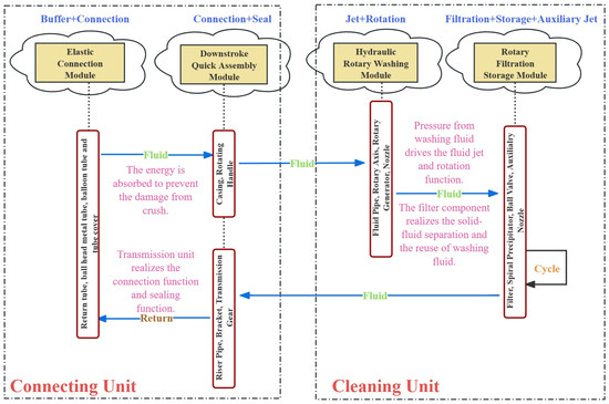 As shown in Figure 2 and Figure 3, the jet wellbore cleaning device consists of a connecting unit and a cleaning unit. When the device is working, the downstroke quick-assembly module is first used to realize the fast connection and position correction between the device and the flushing fluid pipeline. The elastic connection module can effectively absorb the energy generated and reduce the damage to the equipment caused by collisions that may occur when the cleaning device enters the wellbore. After the cleaning device enters the wellbore, the washing fluid drives the hydraulic rotary washing module to continuously rotate and clean the wellbore in an all-around way. After cleaning the wellbore, the flushing fluid flows through the rotary filtration storage module, and the separation of mud and sand from the flushing fluid and the reuse of the flushing fluid are realized by rotary centrifugation.
