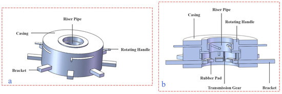 As shown in Figure 5b, the rotating handle is installed in the casing, and the outer side is opened with the gear groove and transmission gear, and the inner protrusion is inserted into the empty groove of the riser pipe wall. The bottom of the riser pipe is embedded within the vertical groove of the side wall of the casing. When pushing the rotating handle, because the bottom of the riser pipe is embedded within the casing, the riser pipe cannot rotate and can only slide upward or downward in the axial direction. At the same time, the rotating handle drives the transmission gear to rotate, so that the bracket slides to the axis, and the lower end of the rotating pipe jointly clamps the liquid inlet pipe of the well washing device and realizes the centering and sealing through the bracket at the front end of the rubber pad. It should be noted that by adjusting the length of the bracket, the module can clamp and connect downhole operation equipment with different standardized specifications, such as a well washing machine, fishing tool, etc., under the condition that the size of the equipment connection end does not exceed the allowable size of the module, to realize the multifunctional utilization ability. Since the standard modelling and data of the downhole equipment have not been collected, a numerical analysis focused on the sealing properties and joint strength has not been completed, and more data support is needed for further design.