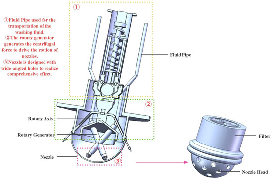 After long-term exploitation of oil and gas wells, particles such as mud and sand in the reservoir near the wellbore migrate and accumulate, which can block the wellbore in severe cases, increase additional resistance for oil and gas flow, and reduce oil and gas production. The well-washing equipment needs to effectively remove such blockages in the inner wall of the wellbore and near the wellbore under extreme conditions, such as high temperature, high pressure, and corrosion [19,20,21]. The traditional wellbore cleaning device has the following problems, which seriously affect the efficiency of the cleaning process and the effectivenesss of wellbore cleaning. First of all, the traditional device is mainly rigidly connected, and the resistance to impact load that may occur during transportation and cleaning is insufficient, which can easily cause bending or damage to the device. Secondly, the installation and removal efficiency of the existing cleaning device is low, and the manual assembly and correction bring additional manpower consumption and prolong the non-working time of the device. Third, the traditional cleaning device has low efficiency in terms of the use of the well washing fluid. The well washing fluid is pumped into the wellbore at high speed and then flows back at high speed. The wellbore is cleaned by the erosion effect. Most of the well washing fluid does not effectively clean the blockage, resulting in great additional energy consumption. Fourthly, the traditional cleaning device takes the fixed axial jet as the main cleaning means. The cleaning range is small, and the coverage area of the jet is insufficient. The cleaning of the shaft wall depends more on the carrying effect of the water reflux, and the cleaning effect is poor. These problems have a great impact on the safe and efficient operation of the wellbore cleaning device, which is an urgent problem to be optimized and solved.