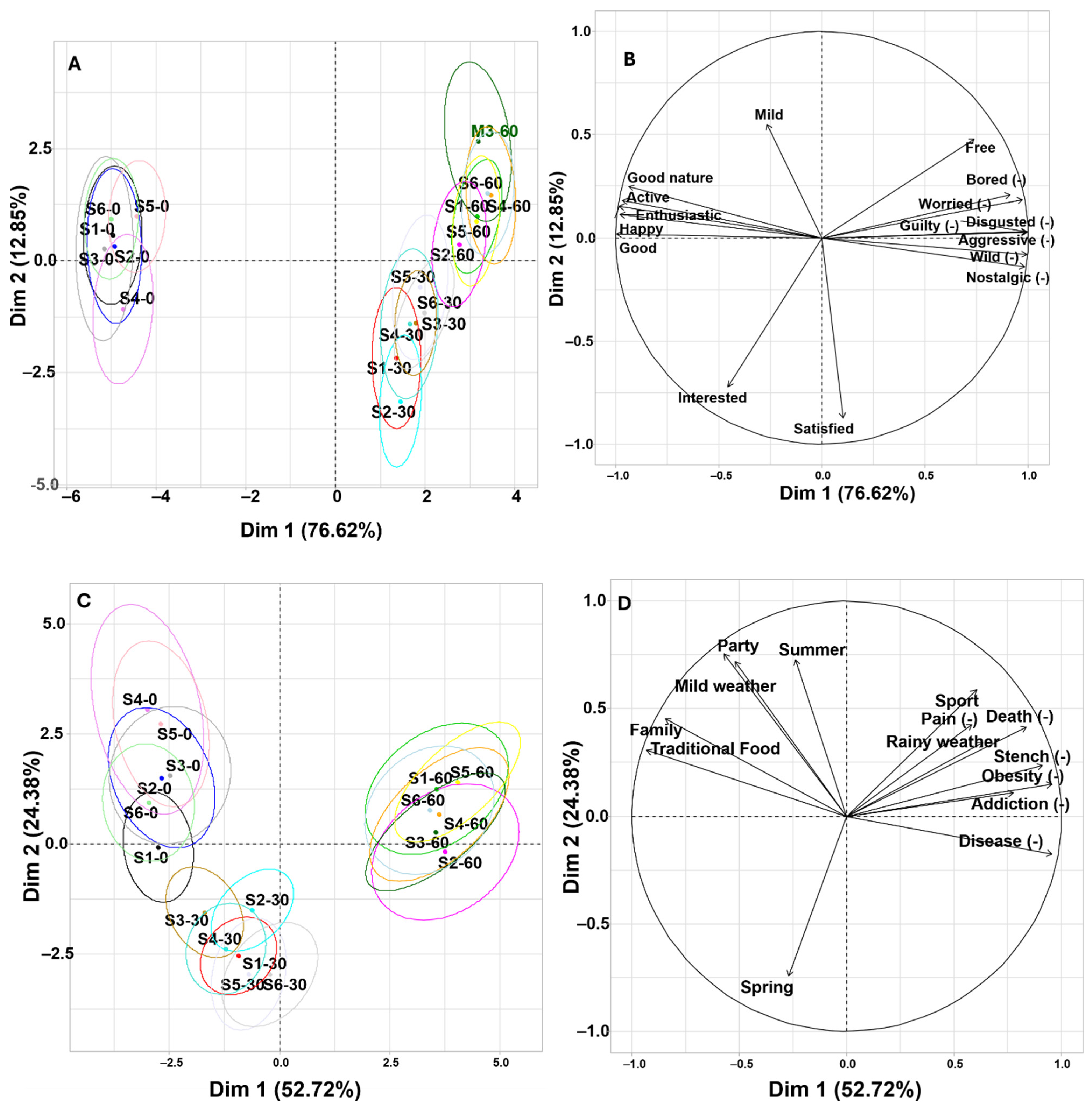 Joyful | 1 | Nostalgic (-) | <0.0001 | Spring | <0.0001 | Poverty (-) | 0.84 |
