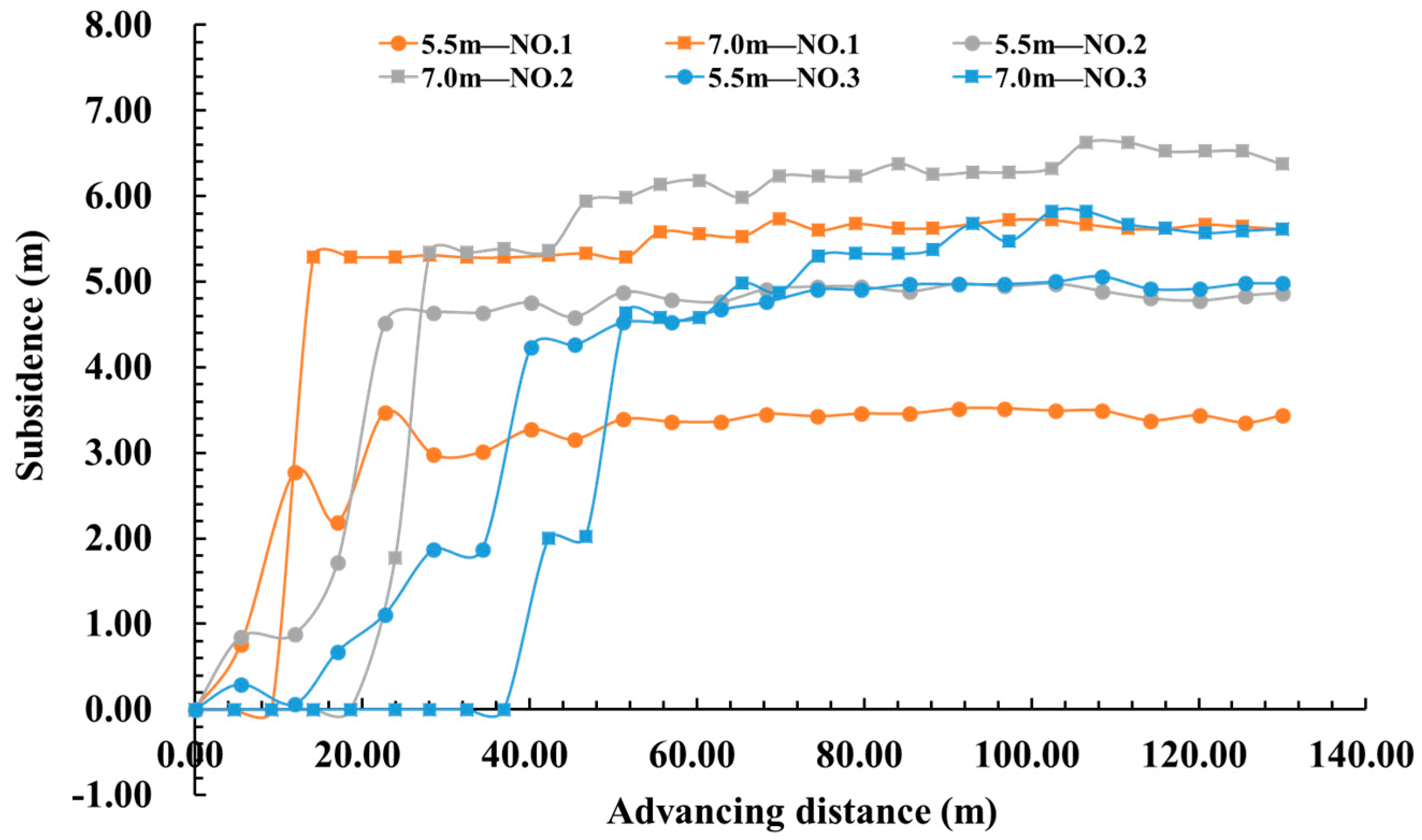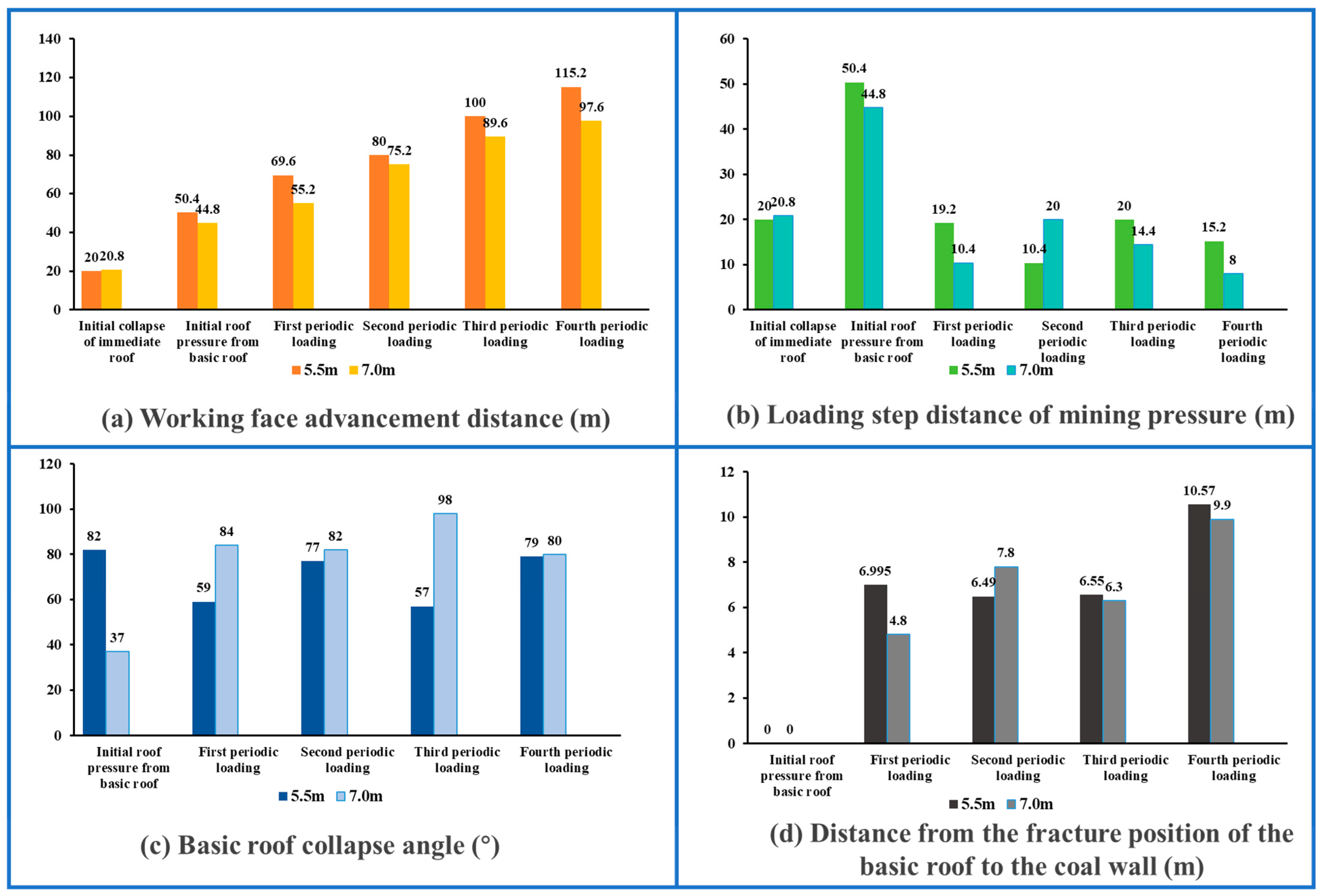 - Based on physical simulation experiments, the characteristics of roof movement can be generally categorized into three stages: immediate roof collapse, stratified fracturing and instability of the basic roof, and periodic fracturing of the basic roof. As mining height increases, instability immediately follows the fracturing of the basic roof, failing to form an effective key block hinge structure. The increased rotational space significantly enlarges the opening of through-layer fissures formed in front of the working face. Moreover, higher mining heights effectively shorten the loading step distance of mining pressure, increase the collapse angle of the basic roof, and elevate the risk of sudden collapse, leading to unexpected loading on the working face.