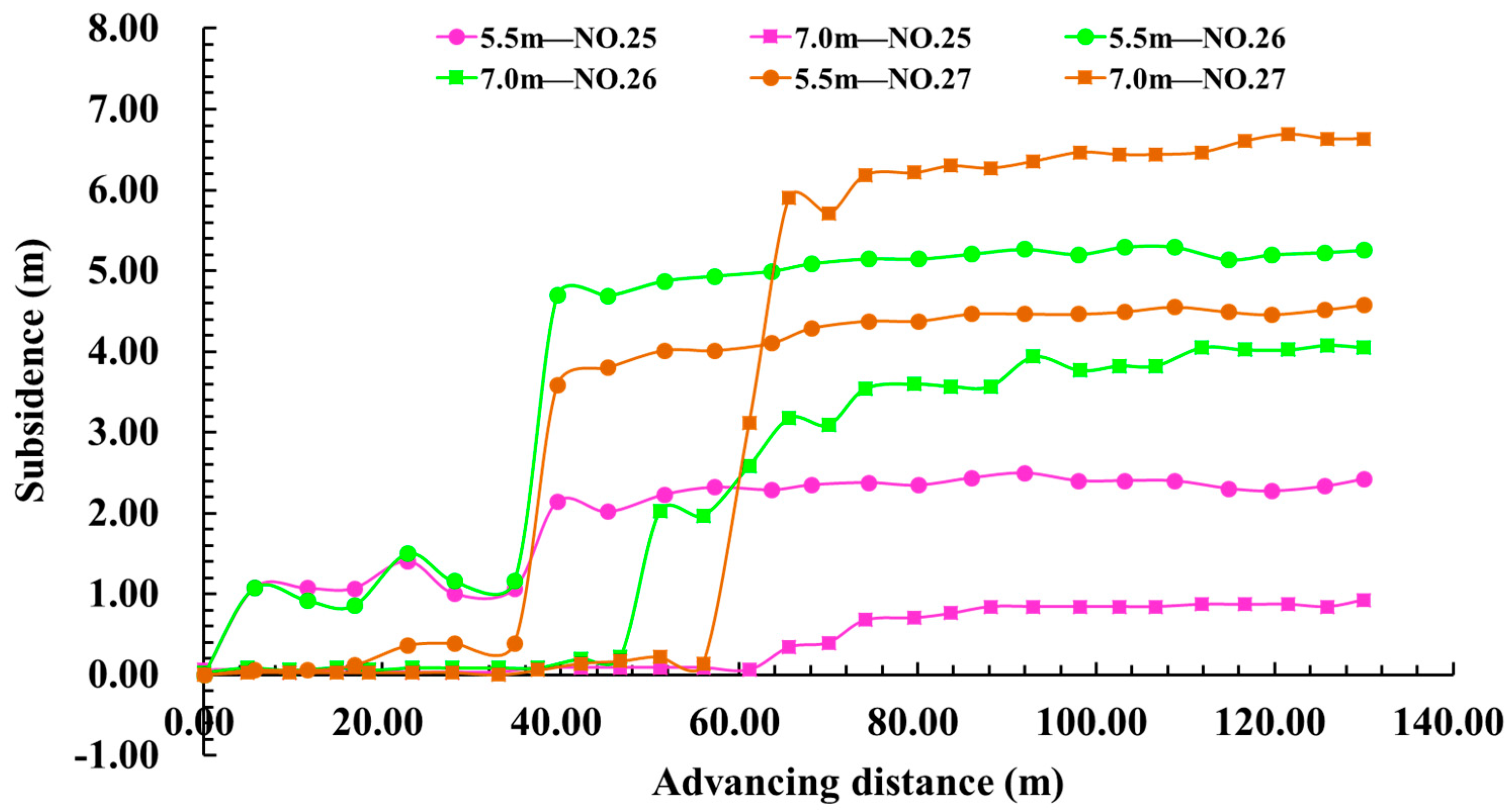 - In accordance with the mining operation schedule, and based on time and geometric similarity ratios, each coal cut was allocated 11 min, with an advance of 0.8 m, resulting in a total daily advancement of 12 m to simulate the real mining process. The cumulative advancement of the working face reached 130 m. Throughout the simulation, the total station and digital camera were utilized in conjunction to monitor and record the roof movement in real-time.