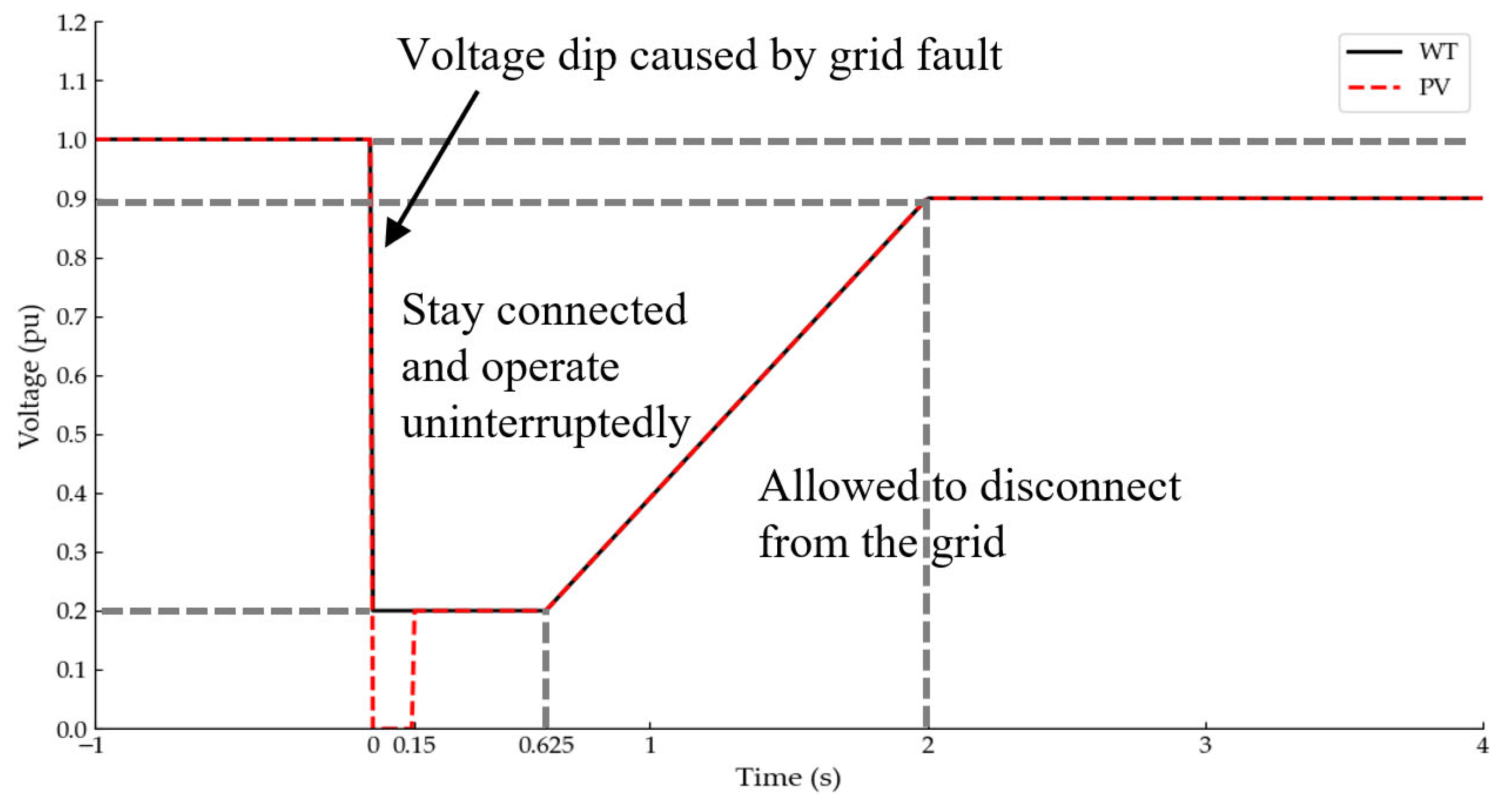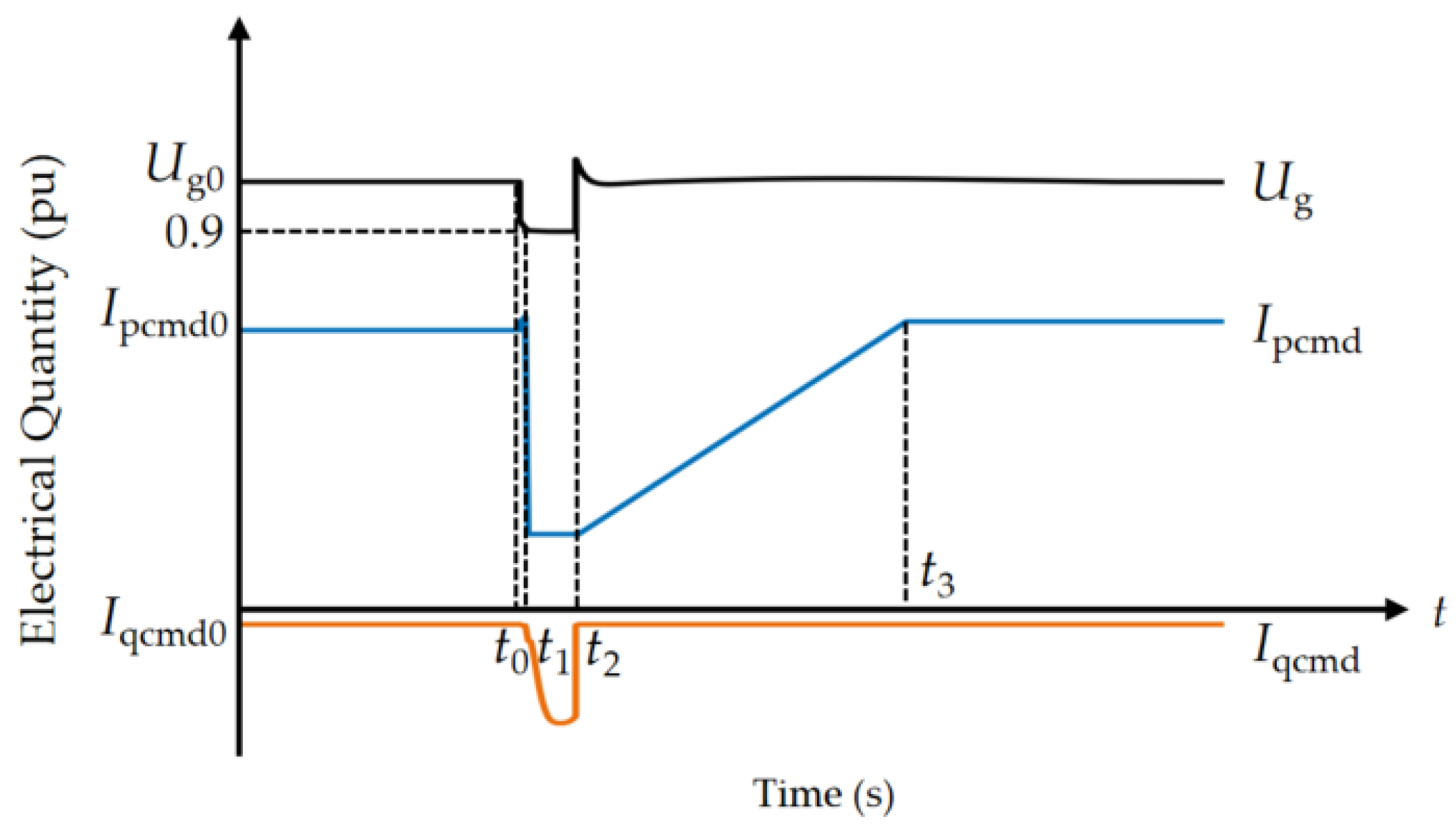 - t1: The starting moment the equipment switches from the normal operation state to the fault operation state, such as the moment the renewable energy unit enters the LVRT state (shown in Figure 2), the instant the renewable energy PCC voltage exceeds the limit (shown in Figure 3), and the moment DC commutation failure occurs (shown in Figure 5).