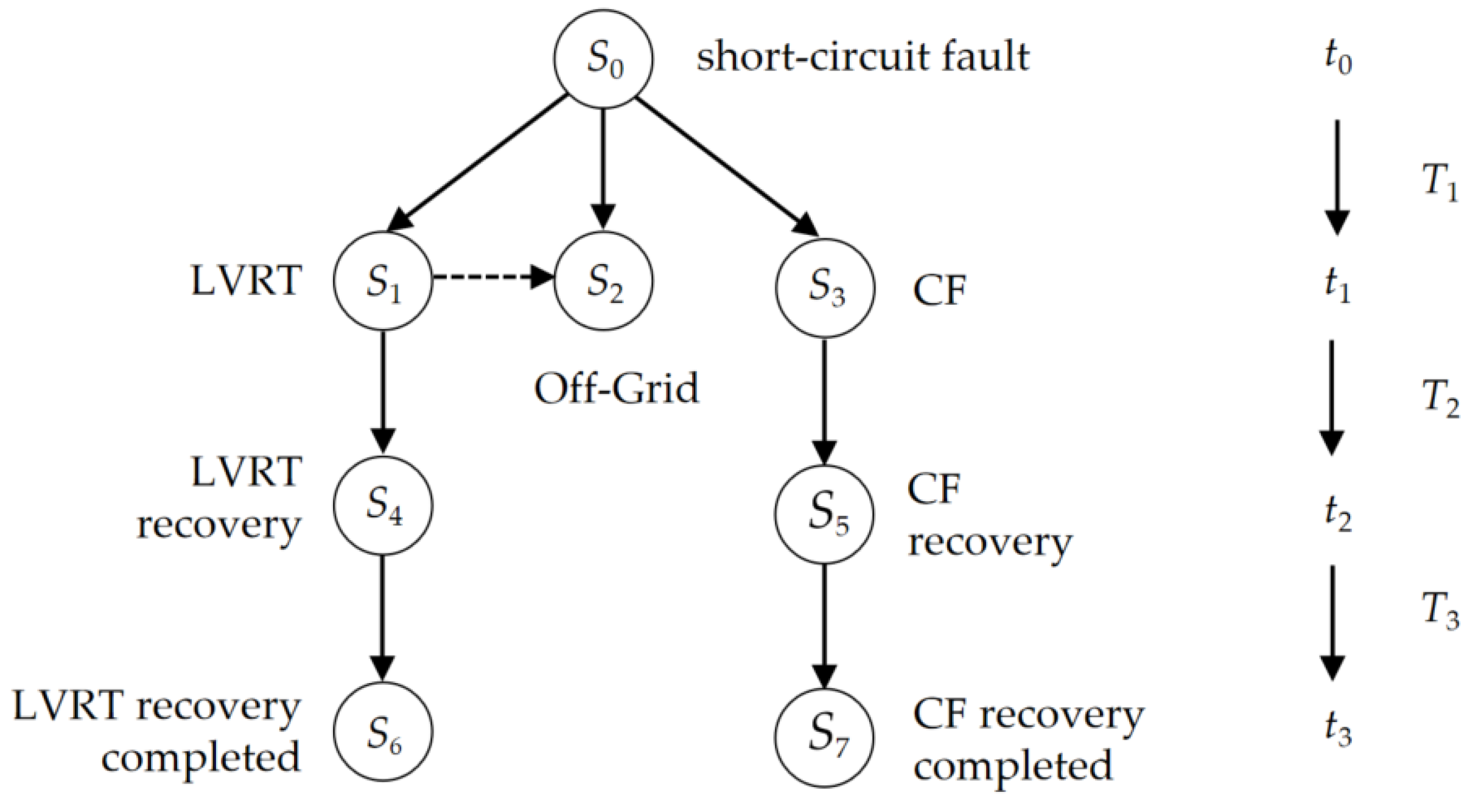 - This paper constructs a directed weighted graph to describe the transient evolution process following a short-circuit fault. By thoroughly analyzing the state transition logic of renewable energy LVRT, renewable energy tripping, and DC CF, we define key temporal parameters to quantify the duration of different states.