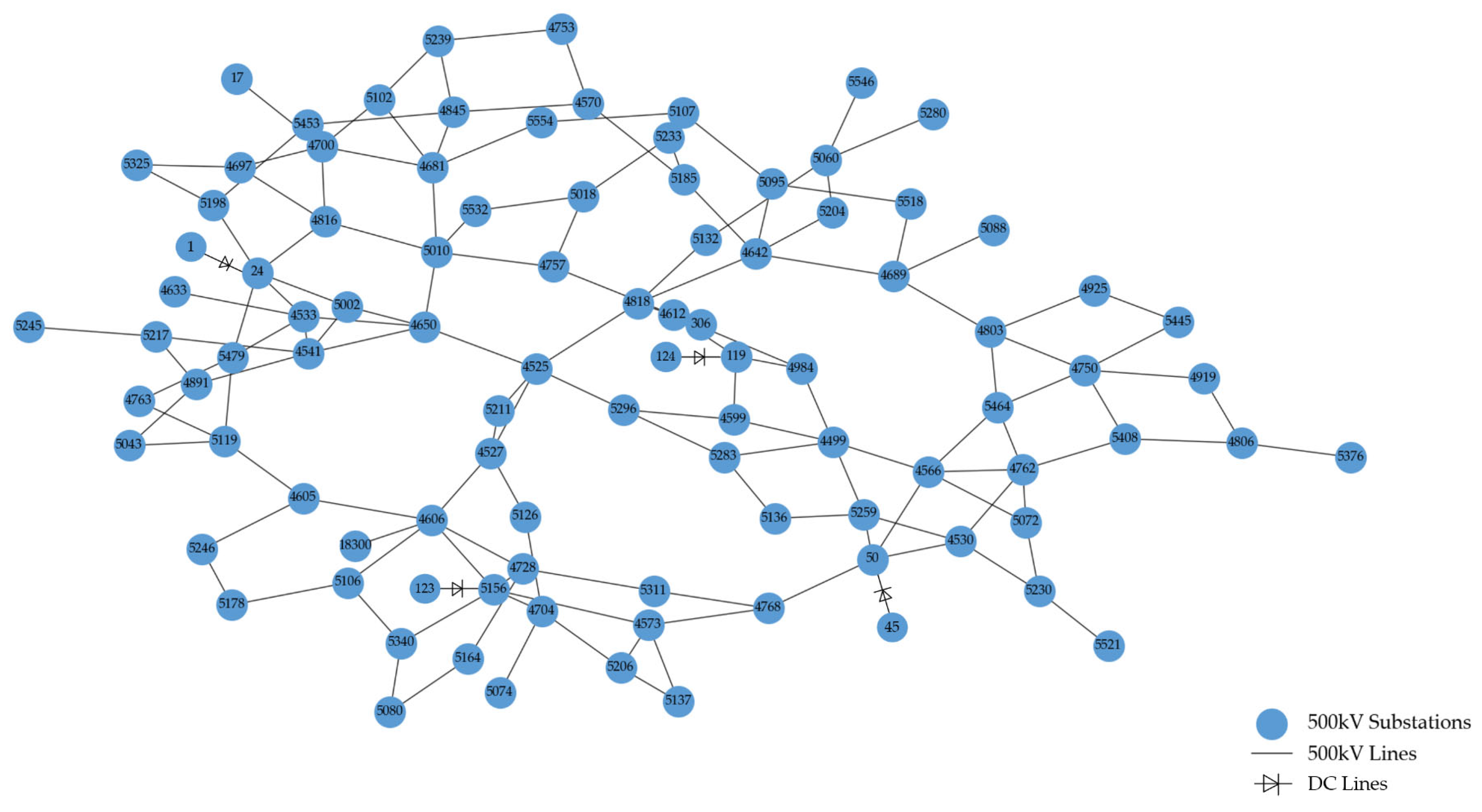 - Initial fault 2: the fault line is a 220 kV line (5418, 18,330), the fault duration is 0.14 s, and the fault grounding impedance is 5.6 × 10−5 pu.