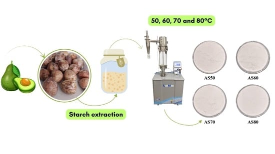 - Martins, S.H.F.; Pontes, K.V.; Fialho, R.L.; Fakhouri, F.M. Extraction and characterization of the starch present in the avocado seed (Persea americana mill) for future applications. J. Agric. Food Res. 2022, 8, 100303. [Google Scholar] [CrossRef]