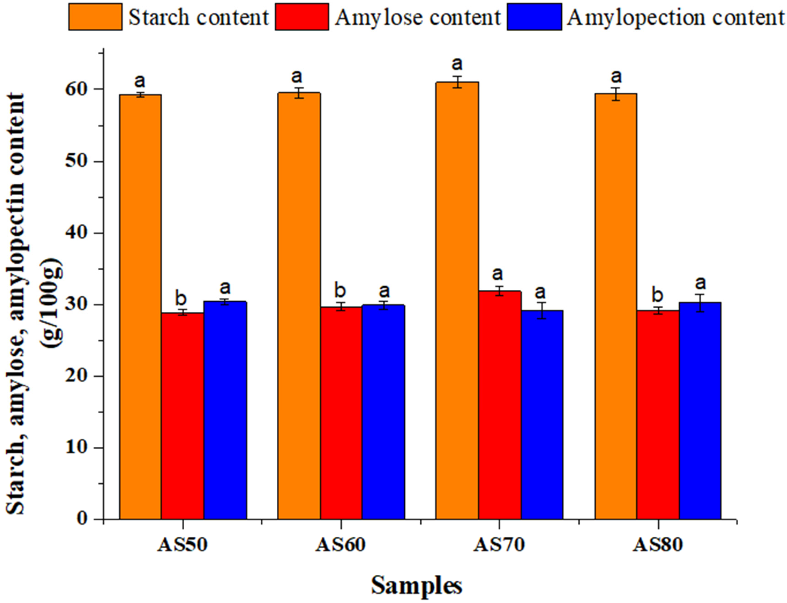 3.2. Starch, Amylose, and Amylopectin Content