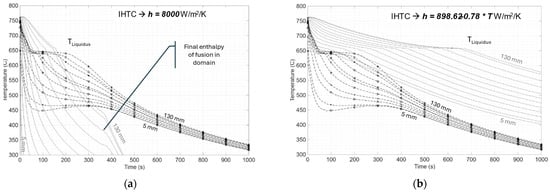 Typical thermal data obtained in ASE for HE700 are shown in the dashed lines with markers, along with the results of the numerical simulation of the domain in the solid lines with (a) constant and (b) variable IHTC as a function of temperature. Both cases use the Schiel–Gulliver paradigm for alloy solidification [2]—Equation (8). The alloy used for this study is the HE700 alloy.