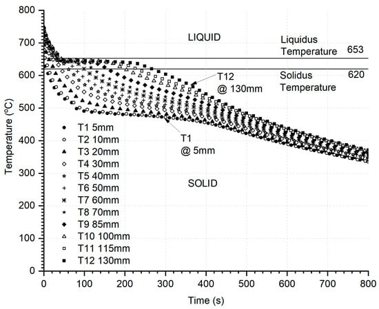 Typical ASE transient thermal data for all 12 thermocouple locations (cooling curves), as shown in Figure 6, were the inputs to the IHTA algorithm. PANDATTM (PandaT software, version PanAl-2024 database, Computherm LLC., Madison, WI, USA), a CALPHAD-based materials design used to compute multicomponent phase diagrams and simulate material properties, was used to carry out non-equilibrium S-G-based solidification simulations for the alloys.