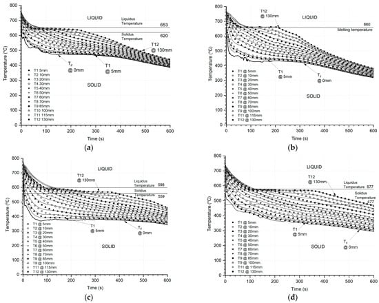 Cooling curves from the predicted transient thermal data from IHTA for all three alloys, HE700, pure Al-P0303, A365, and A383, are shown in Figure 8a–d, respectively. The symbols represent the ASE experimental outcome while the solid lines represent the IHTA prediction within an acceptable maximum error of less than 8%, demonstrating that the ASE analyses may provide reliable inputs for solidification simulation models.