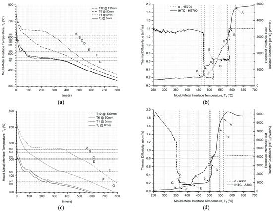 Typical analyses of the thermal data from ASE. (a) and (c) show the interface temperature of the chill interface as a function of the time of solidification of the domain, along with the thermal data for thermocouples at locations 5, 50, and 130 mm for HE700 and A383, respectively. (b) and (d) show the thermal diffusivity α and IHTC in one graph as a function of the interface temperature at the chill plate for the alloys HE700 and A383, respectively, also shown at the salient solidification events starting from location A, which is the start of the solidification of the domain to location G, which is the end of solidification for each alloy.