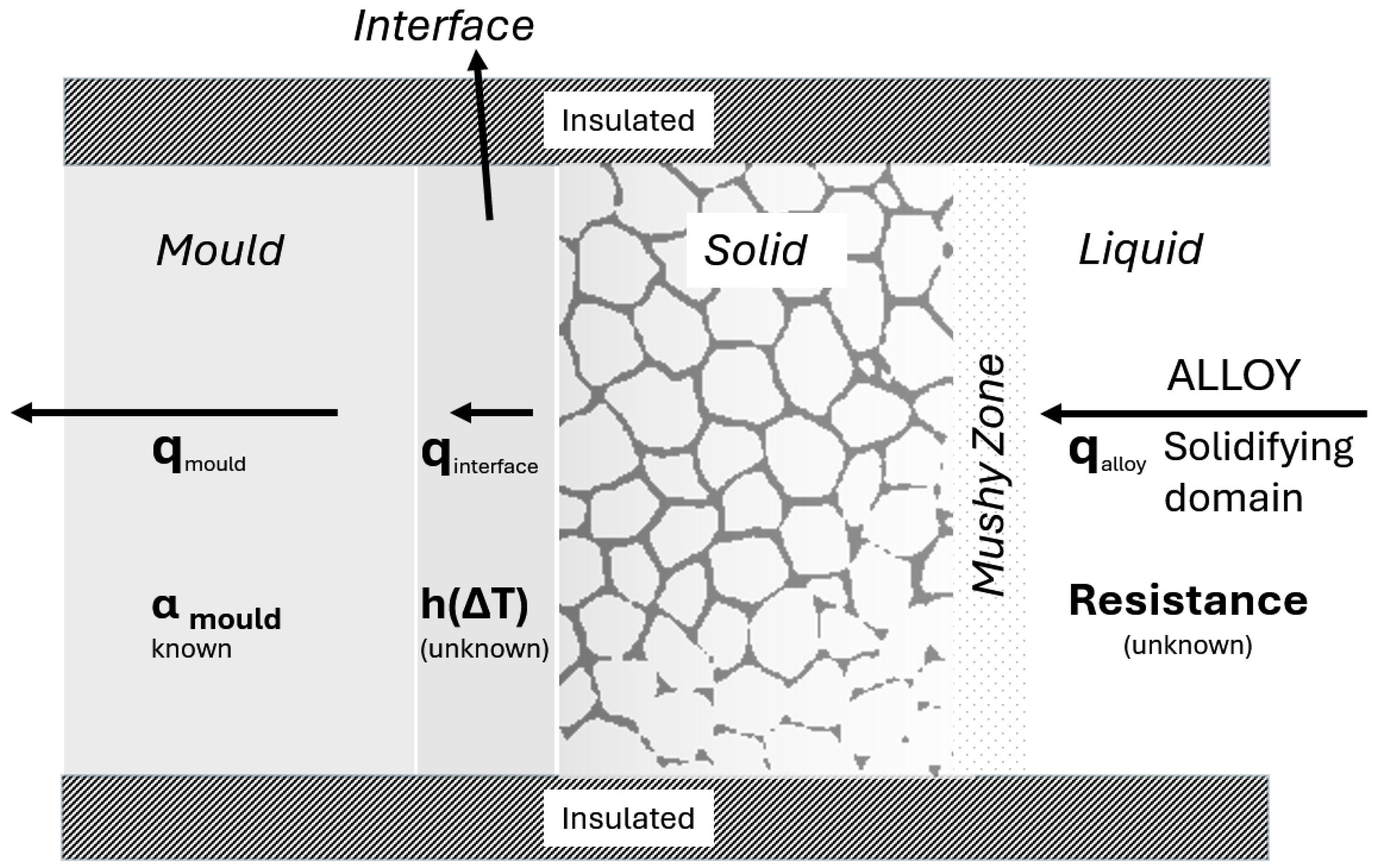 Figure 1, is critical for a valid simulation of the casting process; it is carried out with transient thermal data from controlled experiments in combination with a robust inverse heat-transfer algorithm (IHTA) that iteratively estimates the interface resistance and thermal diffusivity of the solidifying domain, while including the resistance in the solid mold material as well. The thermal resistance of the mold materials is typically well known from background literature sources.