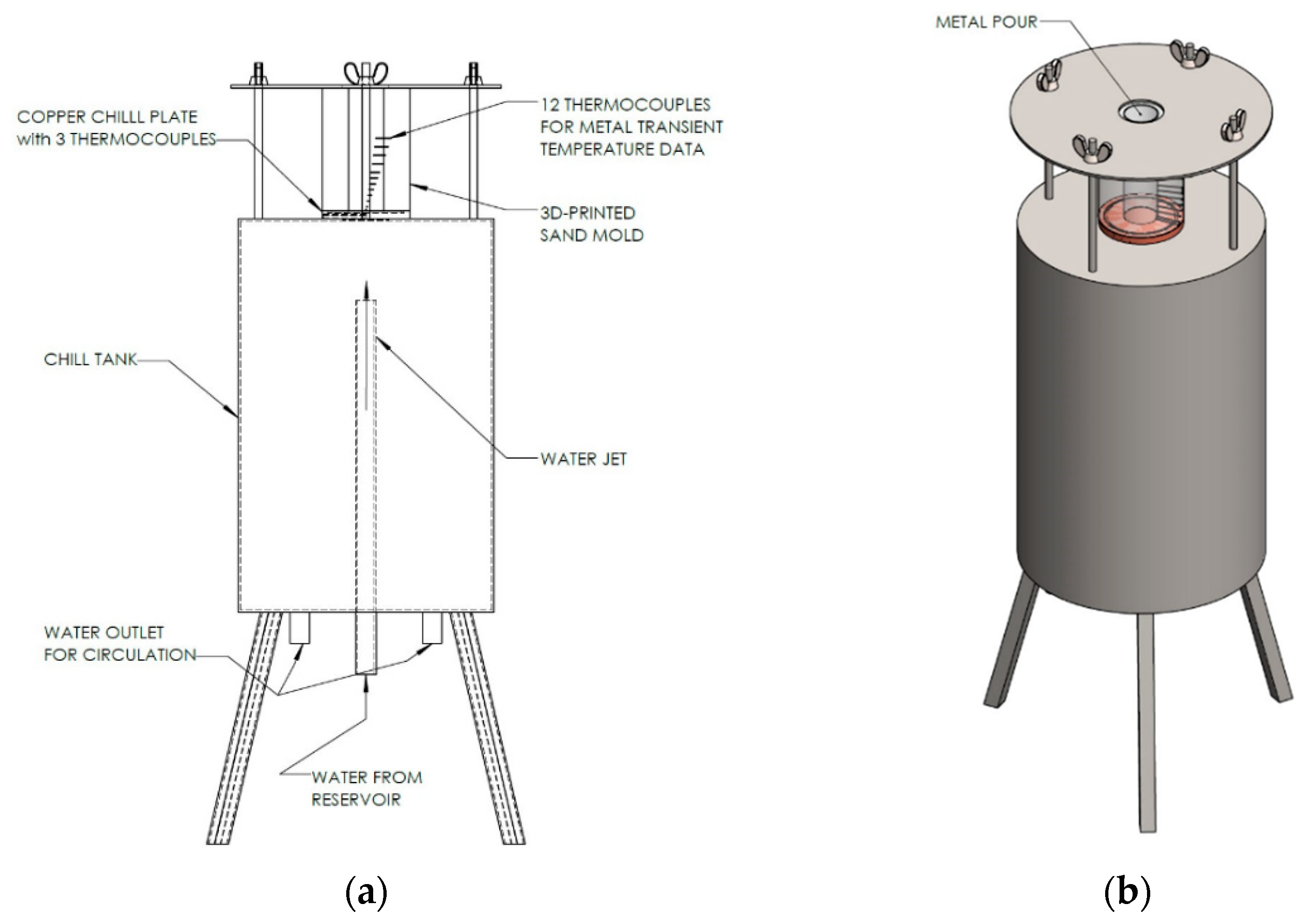 Figure 2. The apparatus consists of a 3D-printed sand mold with 12 K-type thermocouples arranged across the height of the mold from the chill surface. These K-type ungrounded and calibrated thermocouples were of 1 mm (0.04″) diameter with a 0.26 s time constant. The 15 mm thick copper chill plate was designed with three (3) × 1 mm (0.04″) diameter radial holes from the surface to the center (~72 mm deep) to measure the temperature in the chill surface as the metal solidifies in the mold.