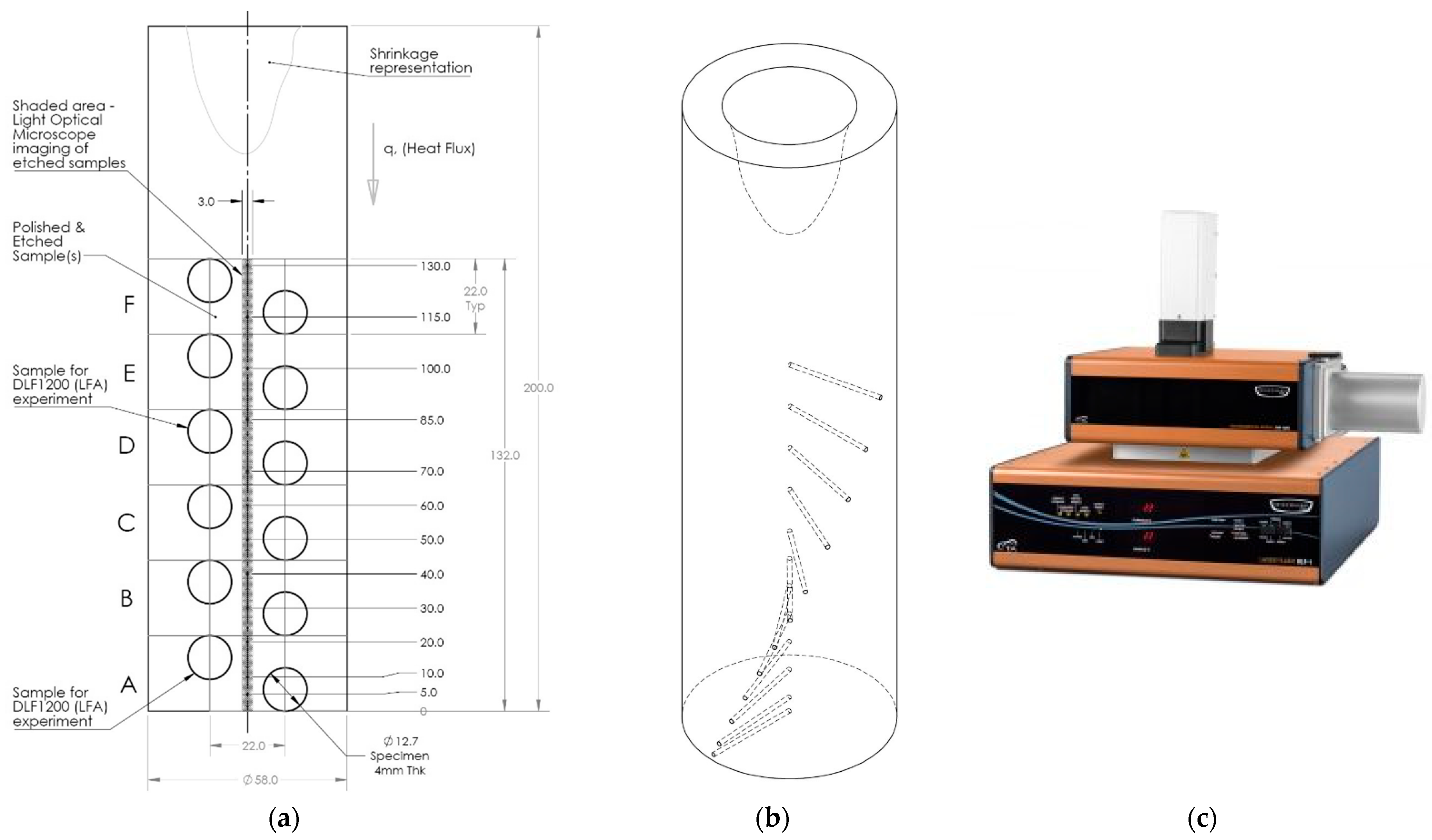 Figure 3a, were machined and cleaned to make the surfaces free from oil and grease, allotted a unique identifier, and coated with a graphite layer before being introduced into the DLF-1200 laser flash analyzer (LFA). These tokens were precisely machined as per the manufacturer’s instructions, with necessary tolerances from the ASE cylindrical casting of HE700, A365, and pure Al (P0303). The tokens were machined such that the heat flow is perpendicular to and across the thickness of the casting sample specimen. In LFA, a laser beam is used to heat a small-area specimen maintained at a steady uniform temperature in a furnace or cryostat. A flash energy is applied with a short interval of time and compared with the resulting thermal transient measured from the temperatures observed on the back surface. Three flash energy tests were carried out at each preheated temperature, and an average of the three readings was noted. The tests were repeated for each sample token subjected to the preheat temperature range of 100 to 500 °C. The LFA method is one of the commonly used transient heat flow methods used to determine the thermal diffusivity and thermal conductivity of a solid material.
