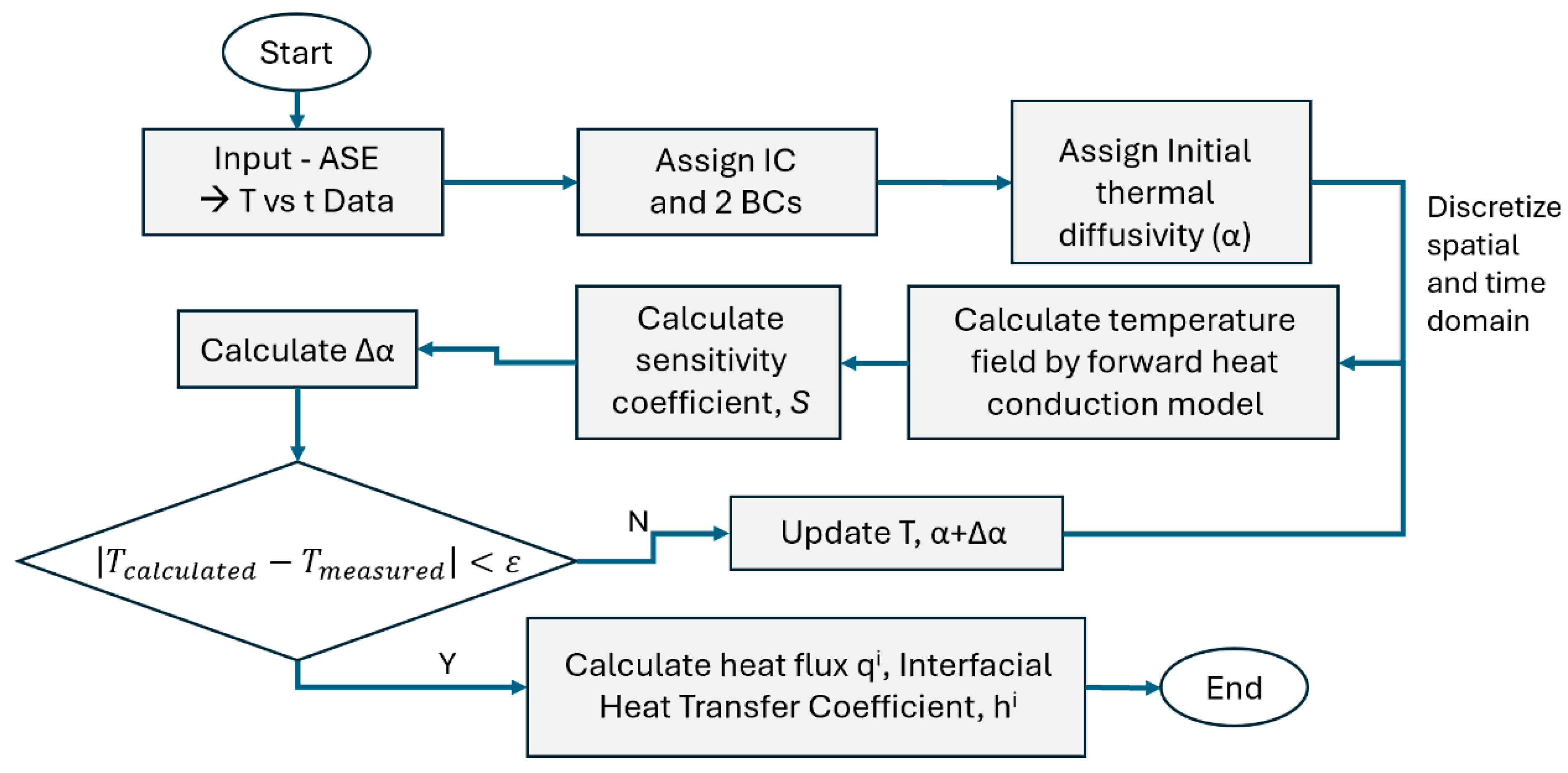 For the incremental value of flux , where j is the time step, the corrected heat flux ‘q’ is given by , and corrected thermal diffusivity ‘α’ is given by . The new temperature, flux, and alpha are taken as initial inputs for the next iteration unless the correction indicates convergence.