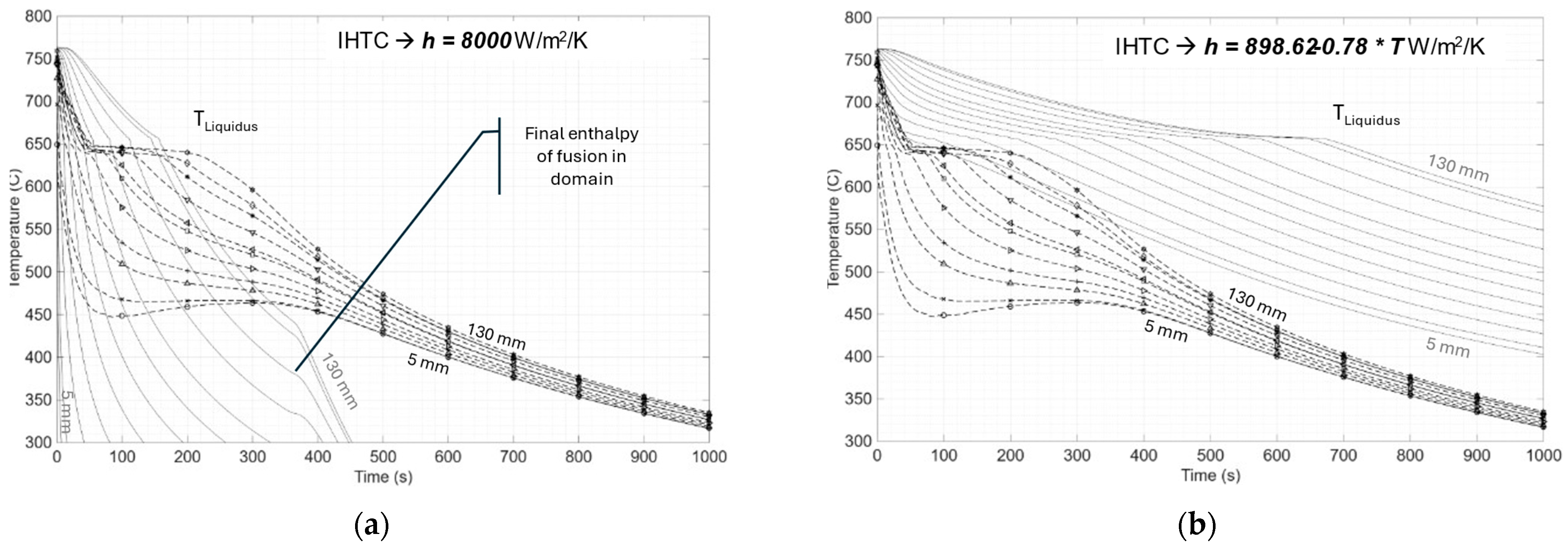 The thermal diffusivity α(T) and interfacial heat-transfer coefficient IHTC(T) obtained in this study are directly applicable to casting simulations operating within cooling rate regimes comparable to those reproduced in the ASE experiments. This includes laboratory solidification tests, gravity-cast components, and permanent mold castings where heat extraction is predominantly unidirectional. However, the applicability of these results to high-pressure die-casting (HPDC), or other high-intensity cooling processes, is limited. These processes involve different thermal conditions, including higher interfacial pressures, intense metal–die contact, rapid melt filling, gap closure/re-opening dynamics, and cooling rates far exceeding those achievable in the ASE apparatus. Consequently, the IHTC(T) and α(T) presented here should not be directly extrapolated to such processes without additional experiments performed under those specific operating conditions. Future work will focus on extending the methodology to HPDC-relevant cooling rates and pressures to establish transferable correlations for industrial simulations.