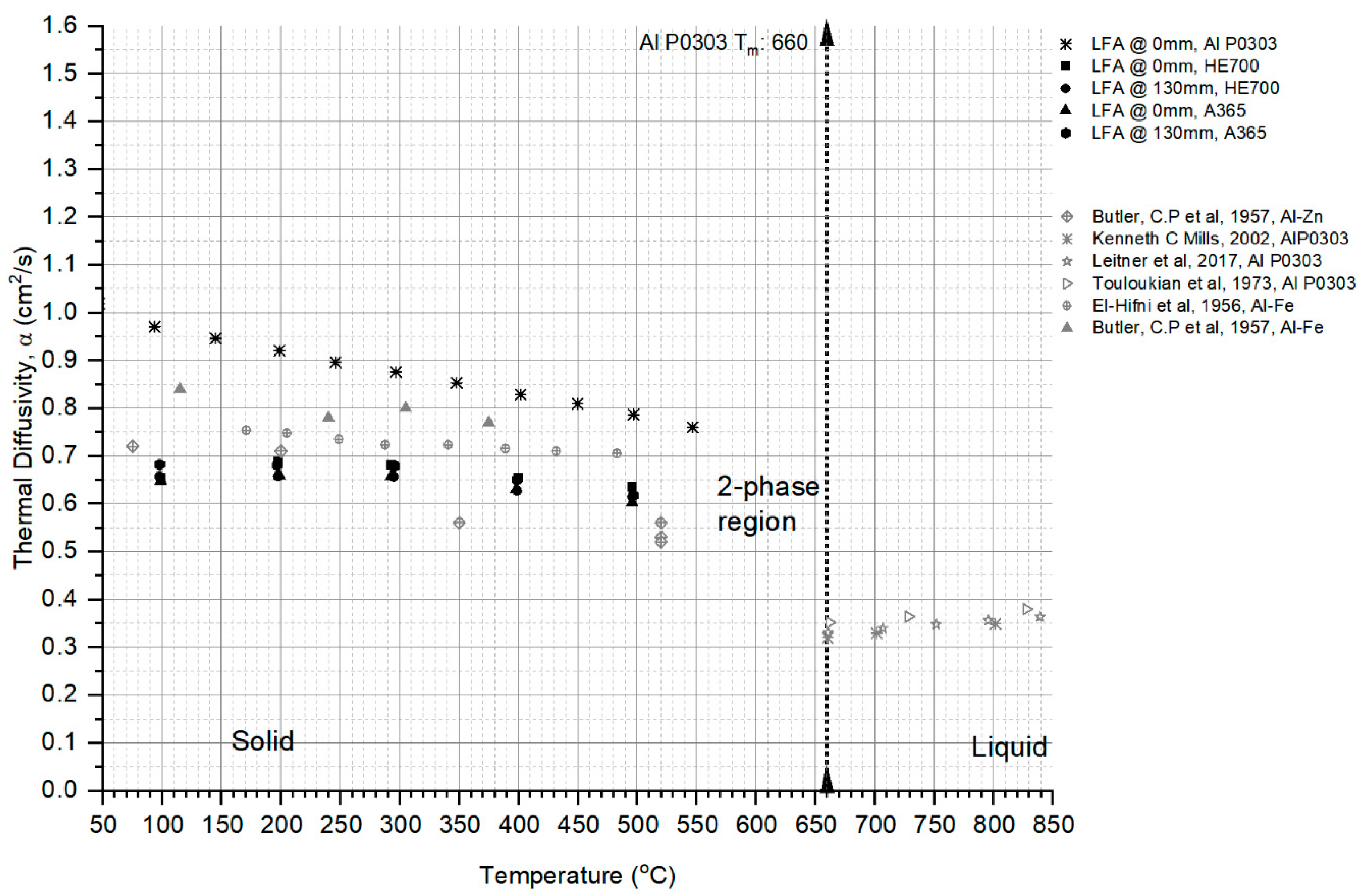 Figure 7. The thermal diffusivity for liquid and solid phases from the prior literature for pure Al (P0303), as well as Al-Fe and Al-Zn binary alloys for the solid phase, are plotted alongside the present work. The ‘α’ values for the solid phase for both HE700 and A365 were lower than those of pure Aluminum [