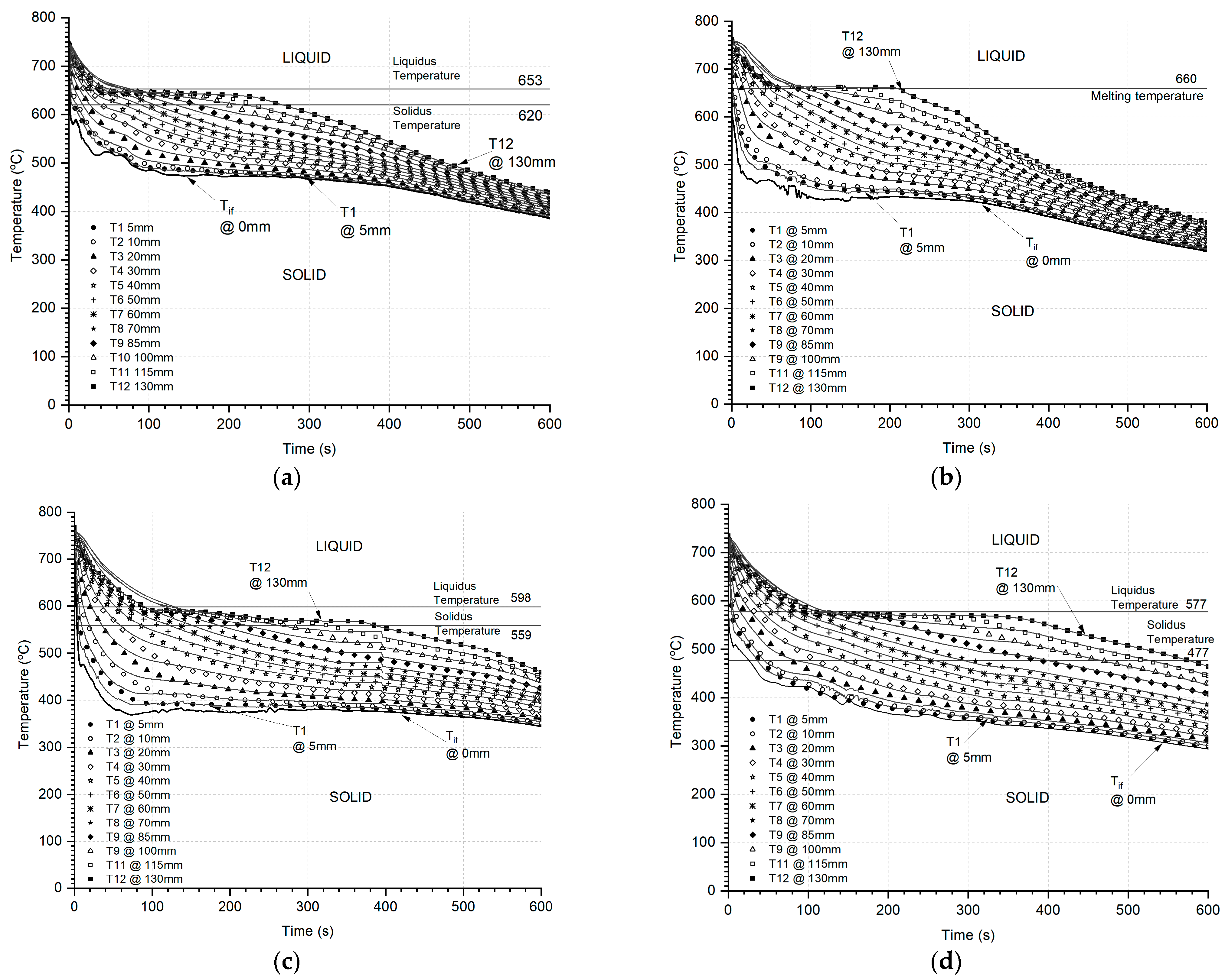Figure 5 presents a comparison between the experiment data obtained from the ASE experiments (this work) and the results of the numerical solutions to the temperature field using the explicit forward difference models; the dotted lines with data markers represent the experiment data from the 12 thermocouples placed against the direction of heat flow, from the chill plate at the mold interface, while the solid lines denote the simulated results of the thermal field in the respective thermocouple locations. The S-G paradigm for alloy solidification was used in both cases, shown in
