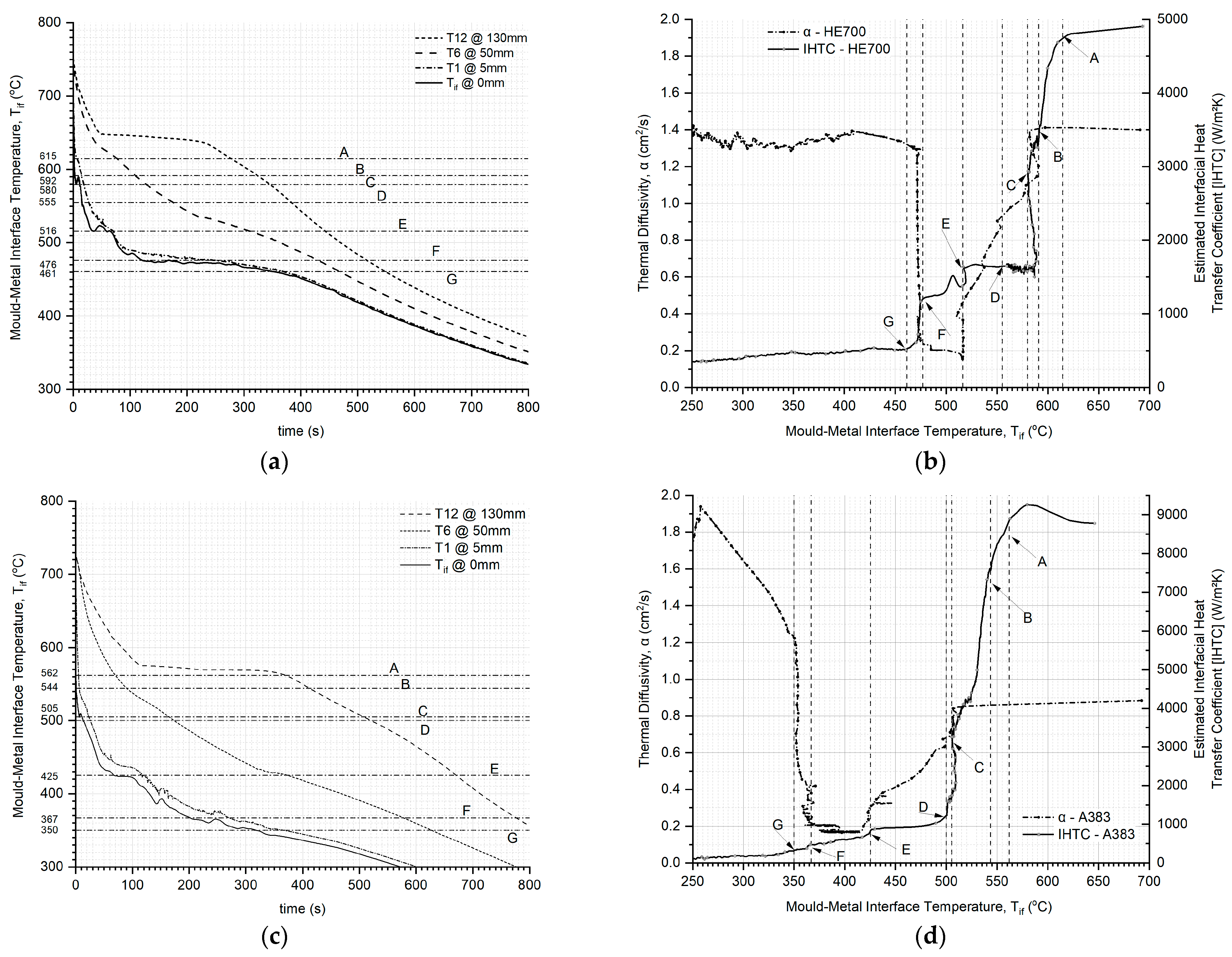The similarity in the variations in α and IHTC for the HE700 and A383 alloys shows similar trends during the solidification of the ASE domain. It is believed that this trend is predictable and could be related to the interface temperature of the solidifying alloy and used as a control factor in solving the thermal field during solidification. There is a difference between the thermal diffusivity values obtained from isothermal experiments, as shown in
