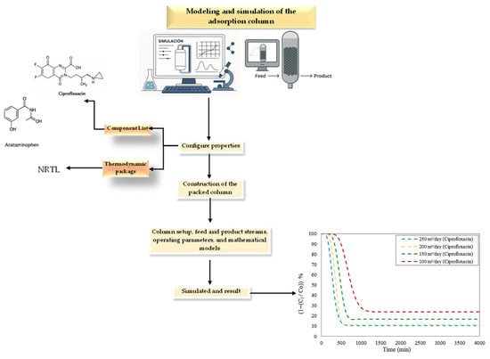 Figure 2 presents the methodology used in this study, which simulates the adsorption column in Aspen Adsorption, considering acetaminophen and ciprofloxacin as pollutants in water bodies.
