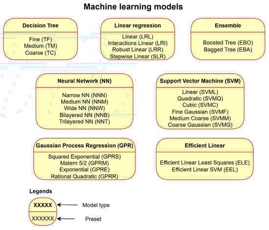 In this research, machine learning techniques were applied to reproduce simulations developed in Aspen Adsorption. Twenty-eight ML algorithms were applied to a dataset of 48 entries on the removal of drug metabolites via adsorption processes, using the Freundlich-LDF and Langmuir-LDF models, which describe the equilibrium and kinetics of the process. The algorithm simulations were performed using the Regression Learner application integrated into MATLAB R2024b, which facilitates the identification of the most appropriate algorithm for modeling the processes under analysis. The 28 ML algorithms used are presented in Figure 3.
