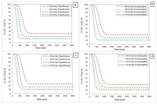 The adsorption column was analyzed by varying the inlet flow rate to 100, 150, 200, and 250 m3/day. During these simulations, the height of the compact bed (3 m) and the initial concentration of both contaminants (50 mg/L) were kept constant to isolate the effect of flow rate on system performance. Figure 4 shows the breakthrough curves for contaminant removal obtained for the isothermal models considered: Freundlich (Figure 4a,b) and Langmuir (Figure 4c,d), both coupled to the LDF kinetic model. These curves indicate the evolution of the adsorption process over time, allowing the fundamental parameters of bed performance to be identified: B.T, S.T, and efficiency.