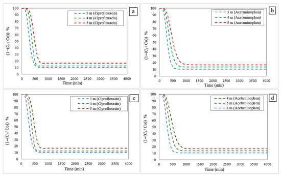 Adsorption profiles of contaminants considering bed heights: (a) Freundlich-LDF model for Ciprofloxacin; (b) Freundlich-LDF model for Acetaminophen; (c) Langmuir-LDF model for Ciprofloxacin; and (d) Langmuir-LDF model for Acetaminophen.