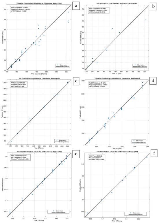 Comparison between actual values and predicted values: for BT (a) validation phase and (b) test phase; for ST (c) validation phase and (d) test phase; for efficiency (e) validation phase and (f) test phase.
