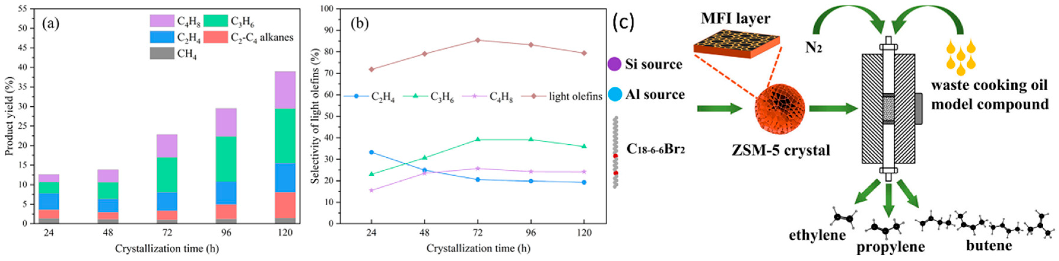 - Liu, Z.; Lou, C.; Yuan, J.; Tang, X.; Fan, Y.; Qi, J.; Zhang, R.; Peng, P.; Liu, G.; Xu, S.; et al. Molecular Self-Gating Inside a Zeolite Catalyst. J. Am. Chem. Soc. 2025, 147, 6126–6136. [Google Scholar] [CrossRef]