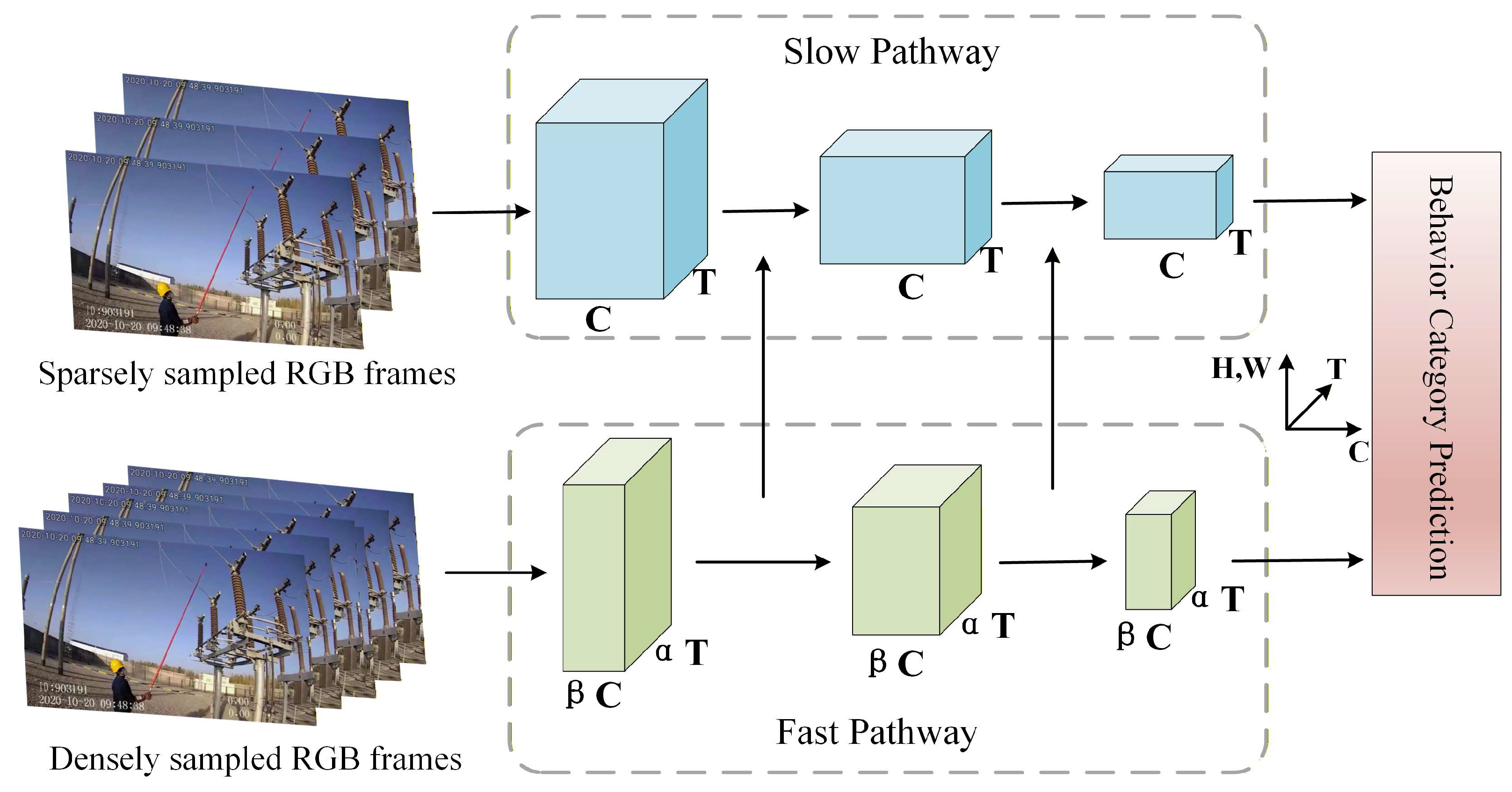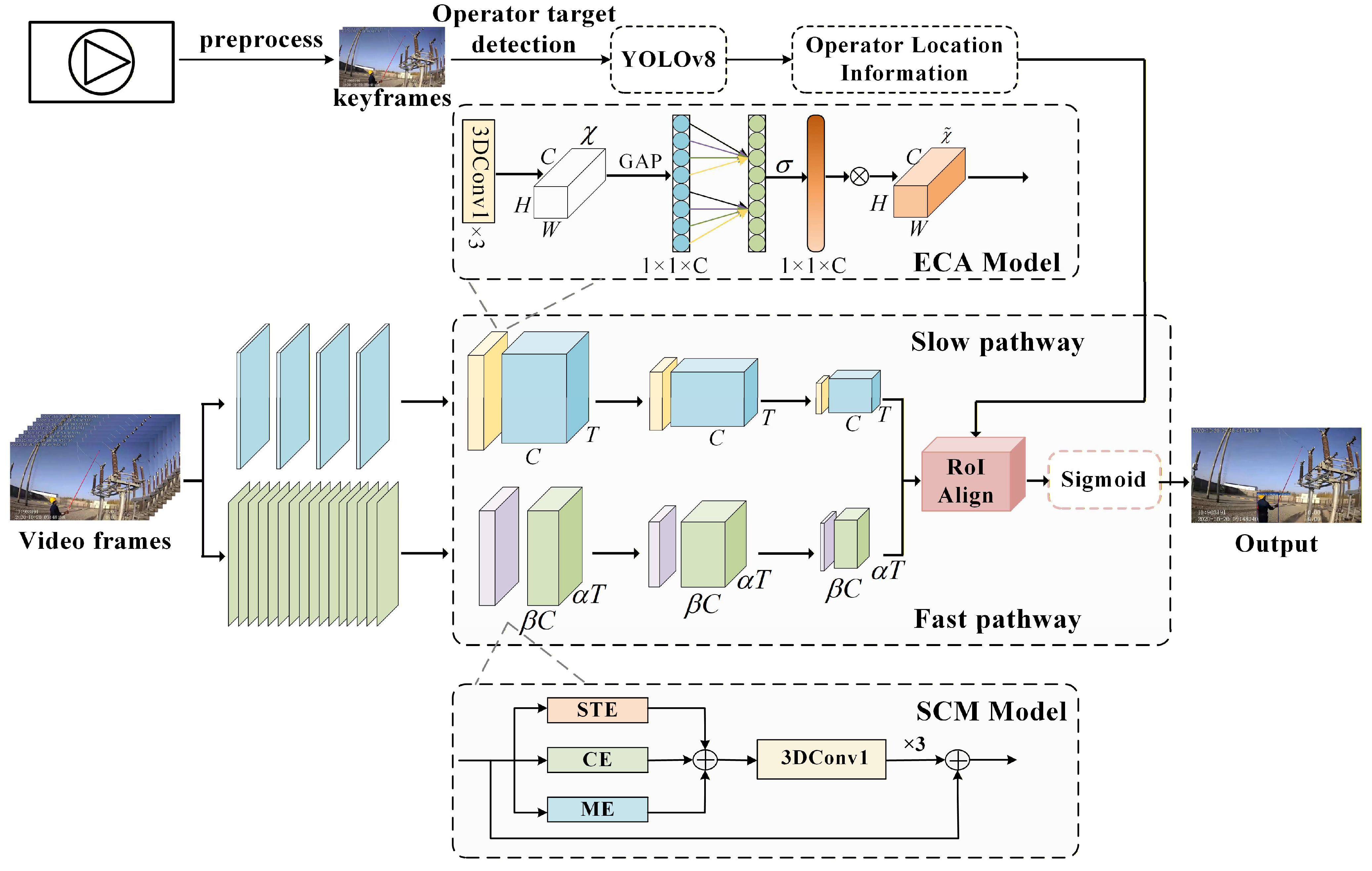- To model the temporal structure formed by continuous posture variations and the alternation of fine-grained local actions, this paper proposes a behavior recognition method based on a dual-path spatiotemporal network. By combining static target localization from YOLOv8 with dynamic behavior recognition from SlowFast, the method achieves accurate detection and continuous action analysis of operator behaviors in substation operation scenarios for both rapid movements and long-duration sequences, thereby improving multi-scenario adaptability.