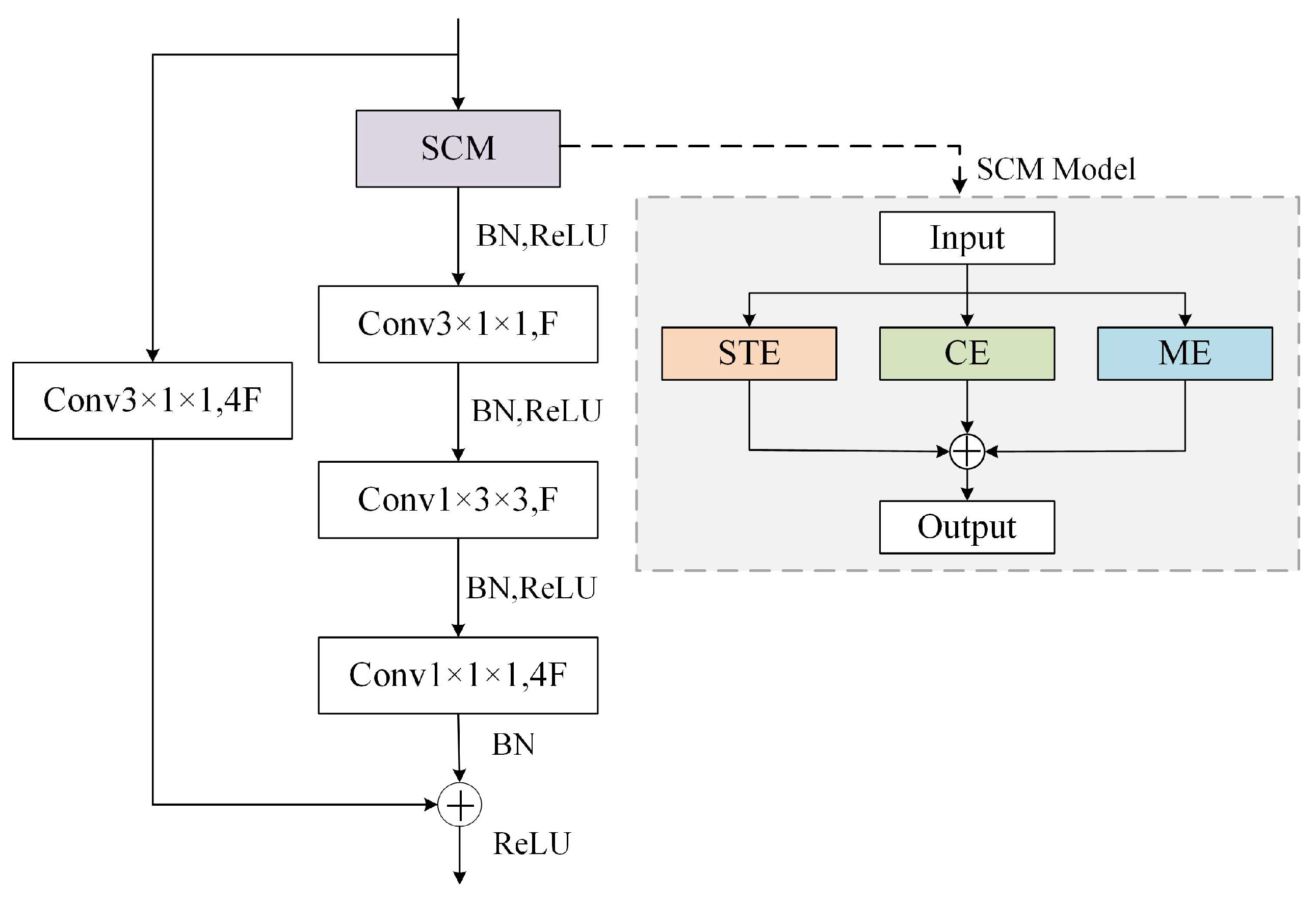 - Considering that operator behaviors exhibit continuity and similarity, a multi-path excitation residual network (SCM-Res) is introduced in the Fast Pathway. By performing weighted fusion of spatial–temporal, channel, and motion information, this module effectively captures fine-grained temporal variations of rapid behaviors between adjacent frames and enhances multi-scale feature fusion capability for fast motions.