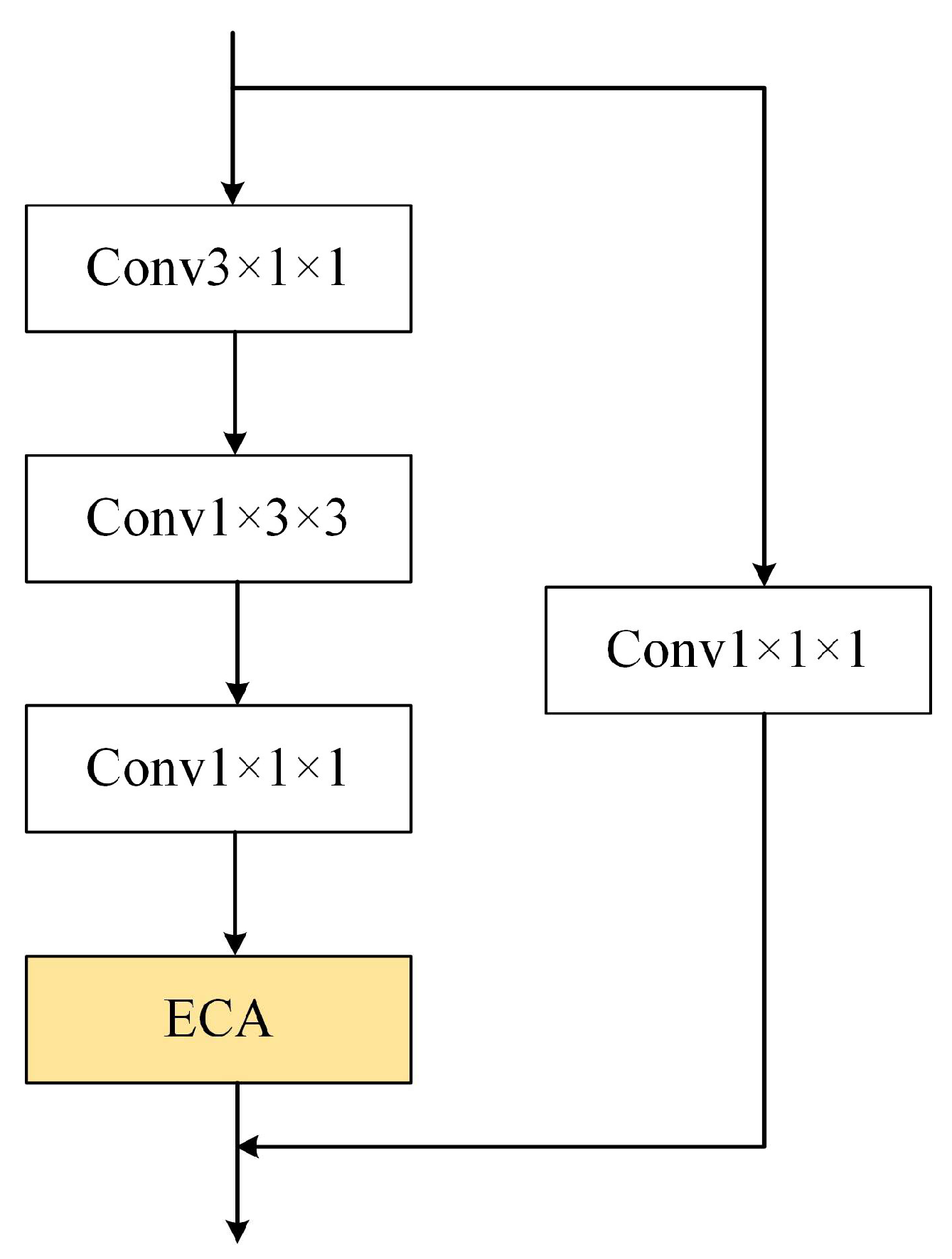 - To address the problems of partial occlusion of operators and limited computational efficiency, an attention mechanism is integrated with the original residual block in the Slow Pathway to form a lightweight ECA-Res module. This design enables efficient channel weight allocation, thereby strengthening the temporal representation capability of long-duration operational postures, while effectively mitigating occlusion-induced interference in dynamic scenes and reducing overall network complexity.