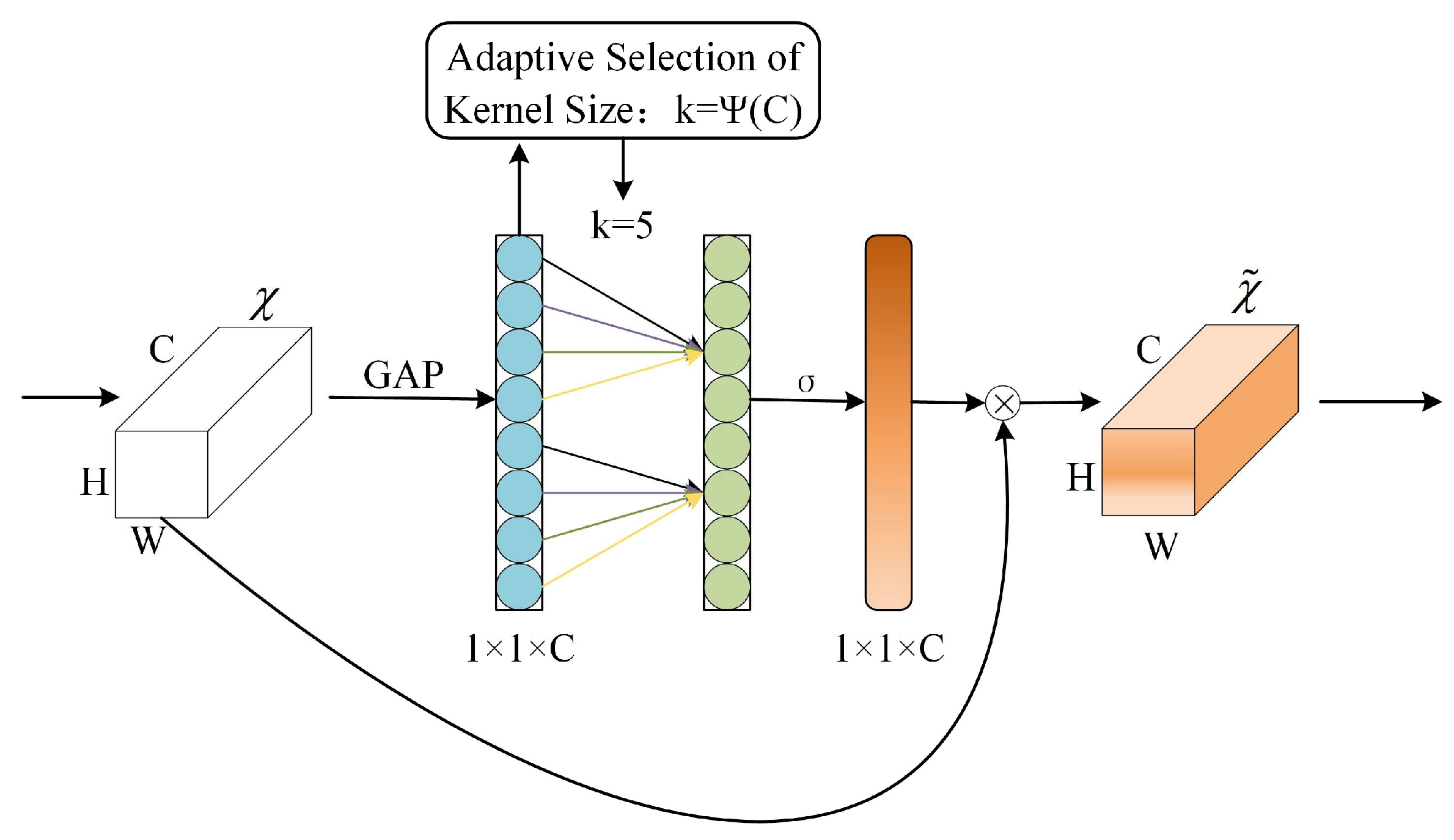 - Calculate the size of the adaptive one-dimensional convolution kernel as shown in Equation (8).where γ and b are hyperparameters, with γ = 2 and b = 1; k represents the kernel size, and C denotes the channel size. The parameters γ and b govern the scaling relationship between the convolution kernel size and the number of channels. This design maintains a small and stable odd-sized convolution kernel across different channel scales, thereby achieving a good balance between channel-wise coverage and computational efficiency.
