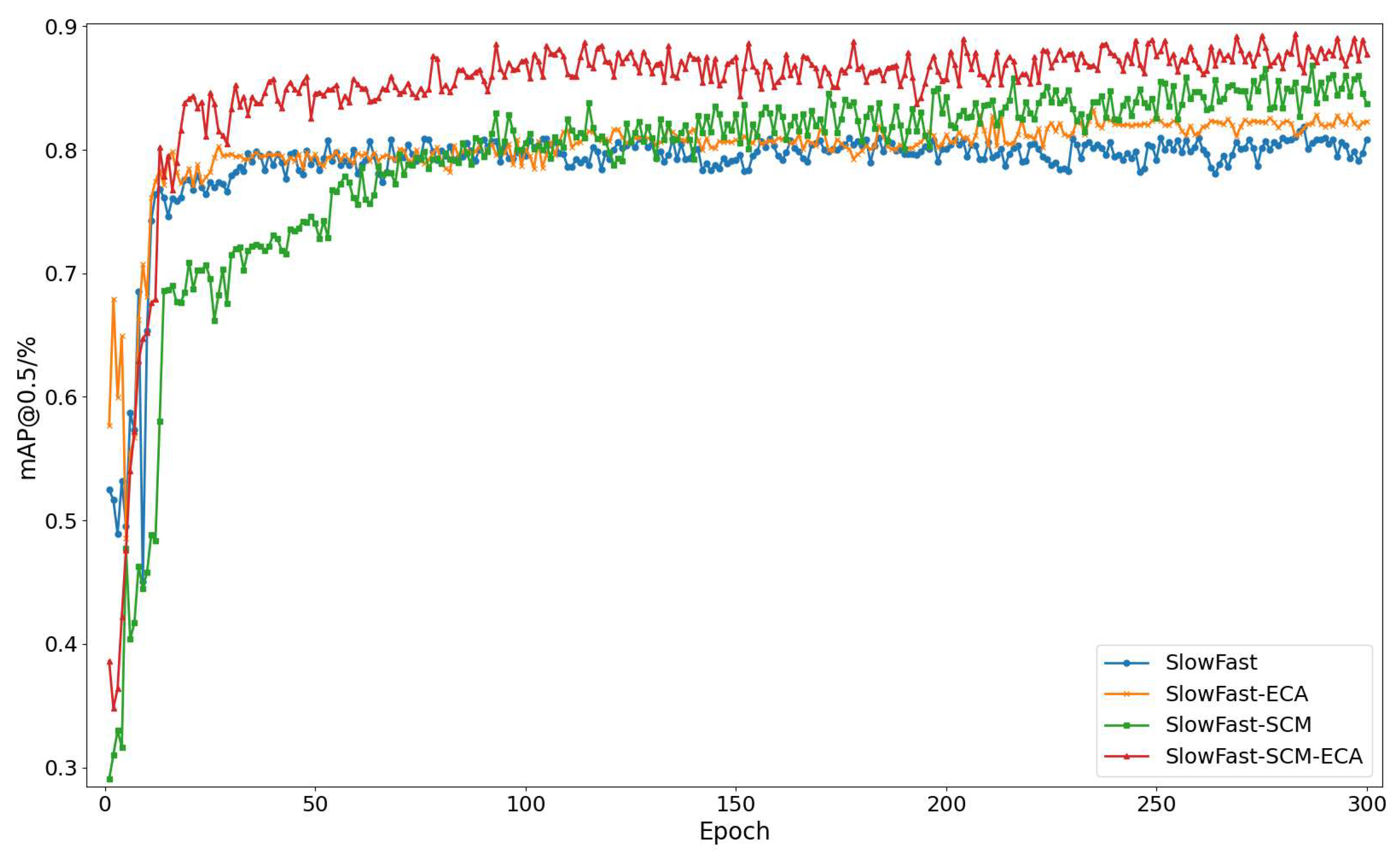 - By incorporating the ECA attention mechanism into the Slow Pathway and the multi-path excitation residual network into the Fast Pathway, the two pathways form a complementary structure during multi-scale spatiotemporal feature fusion, thereby enabling effective representation of long-term postural states and rapid dynamic behaviors in complex operation scenarios.