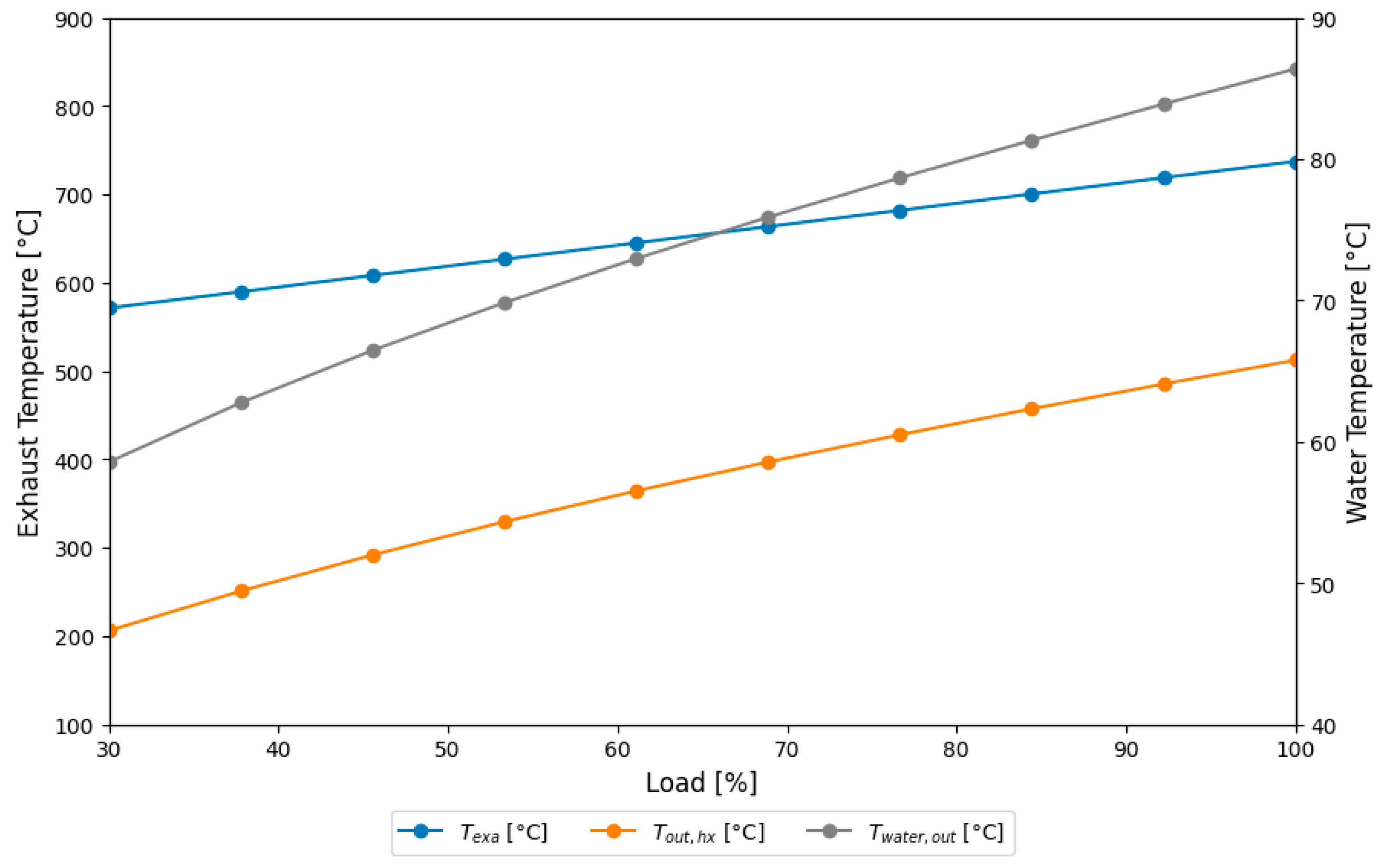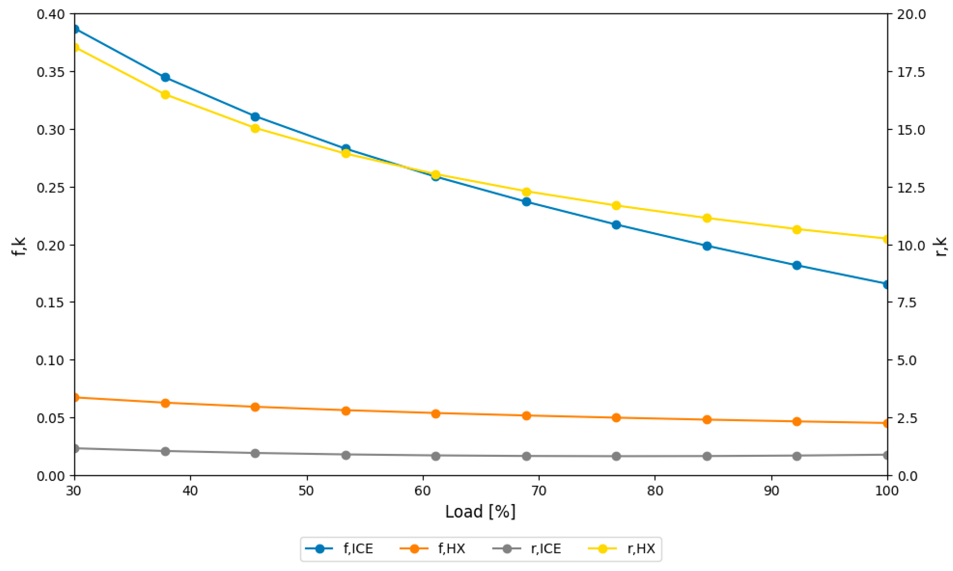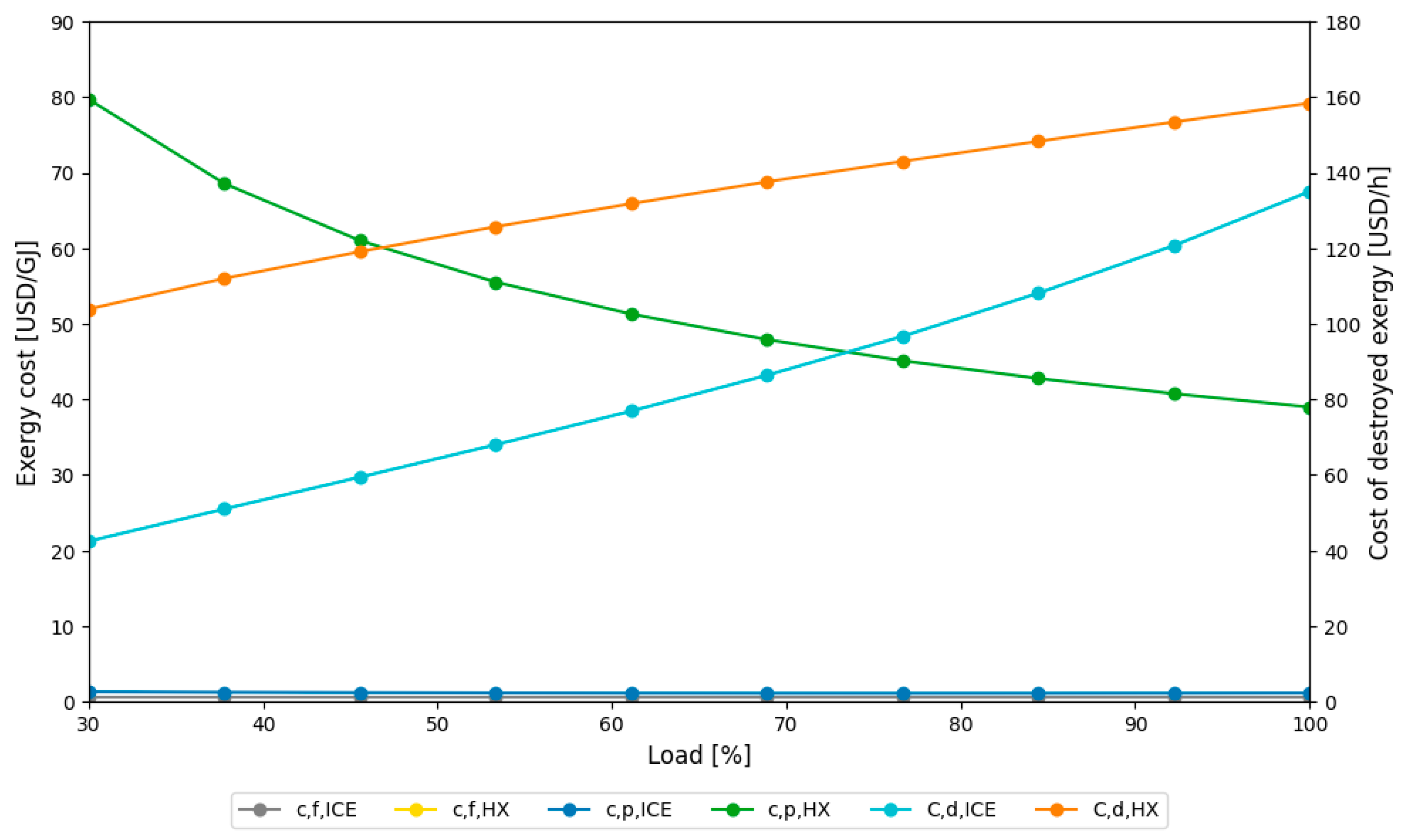 - The best operating range to minimize the unit cost was at full load (100%). At this load, the HX product cost drops from approximately USD/GJ 80 (30% load) to less than USD/GJ 40. The 90% to 100% load range represents the ideal region to counterbalance the reduction in product cost and the maximization of total exergy efficiency, despite the increased cost of destroyed exergy.