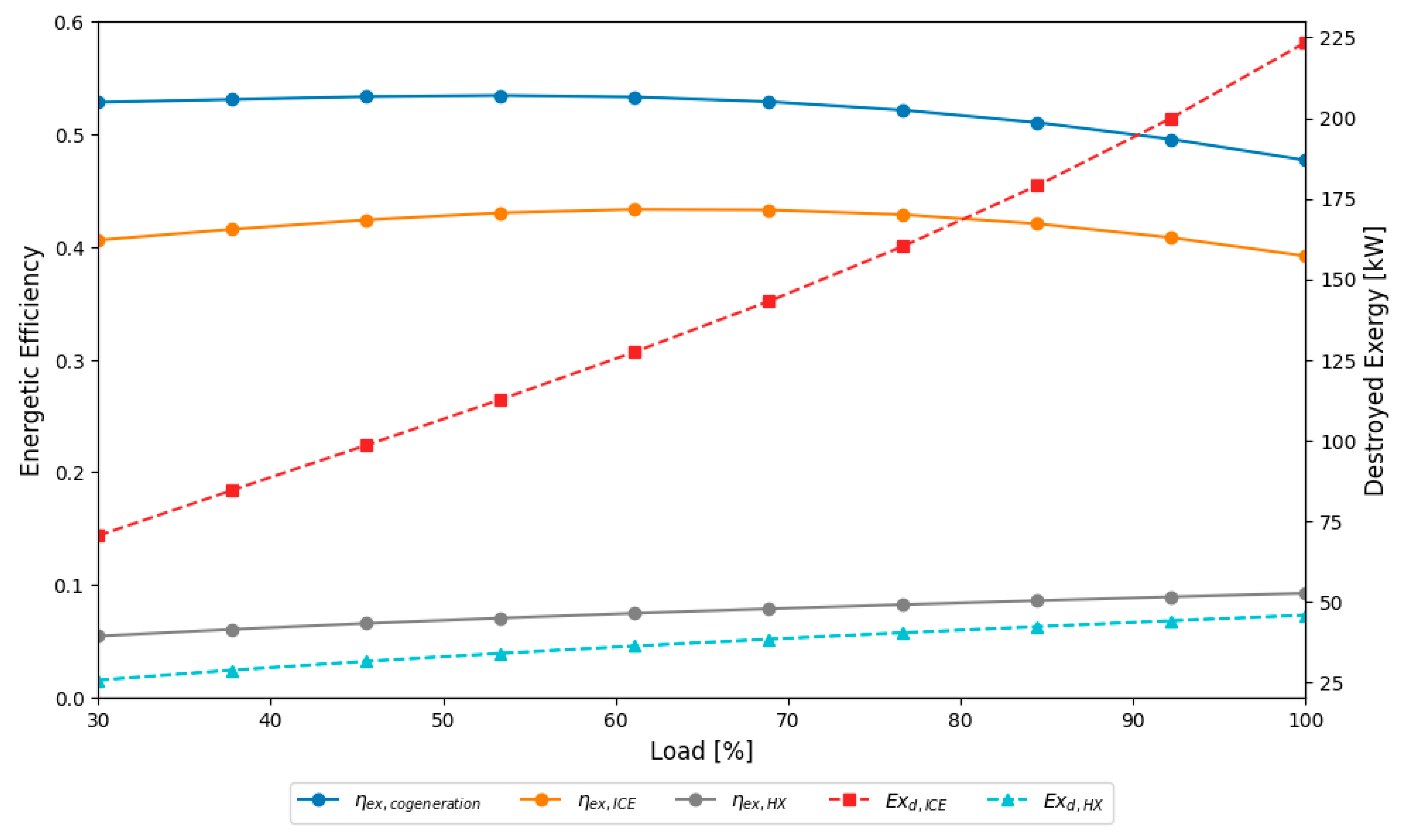 - The exergy destroyed in the Internal Combustion Engine (ICE) was 223.65 kW, while in the heat exchanger (HX) it was 45.67 kW. Regarding exergy efficiencies, the ICE reached 39.19%, while the HX had a low value of around 9%. The low efficiency of the heat exchanger (HX) was attributed to the significant temperature difference between the exhaust gases and the water, resulting in a small temperature and exergy difference across the product fluid (hot water). This indicated a considerable portion of exergy was being wasted.