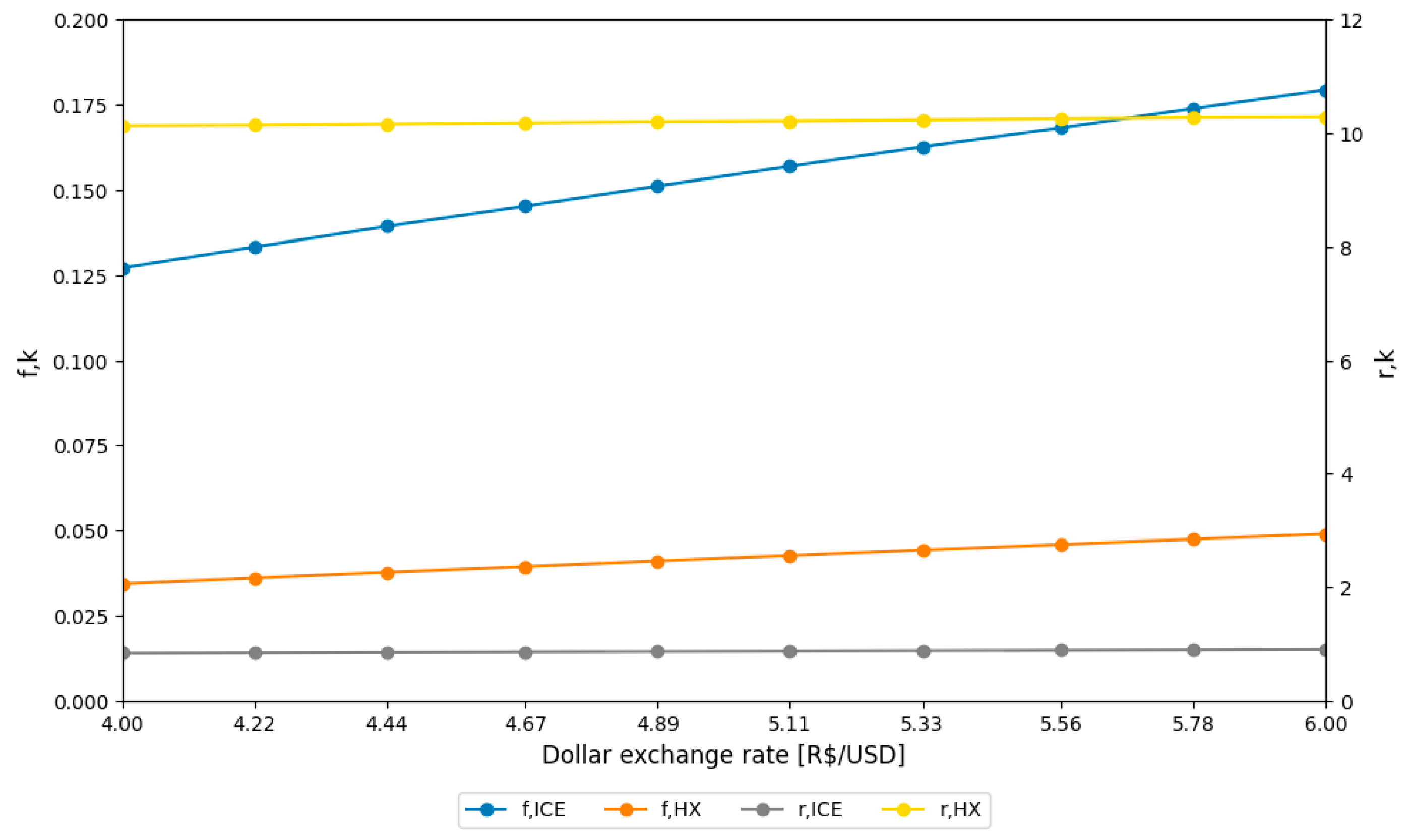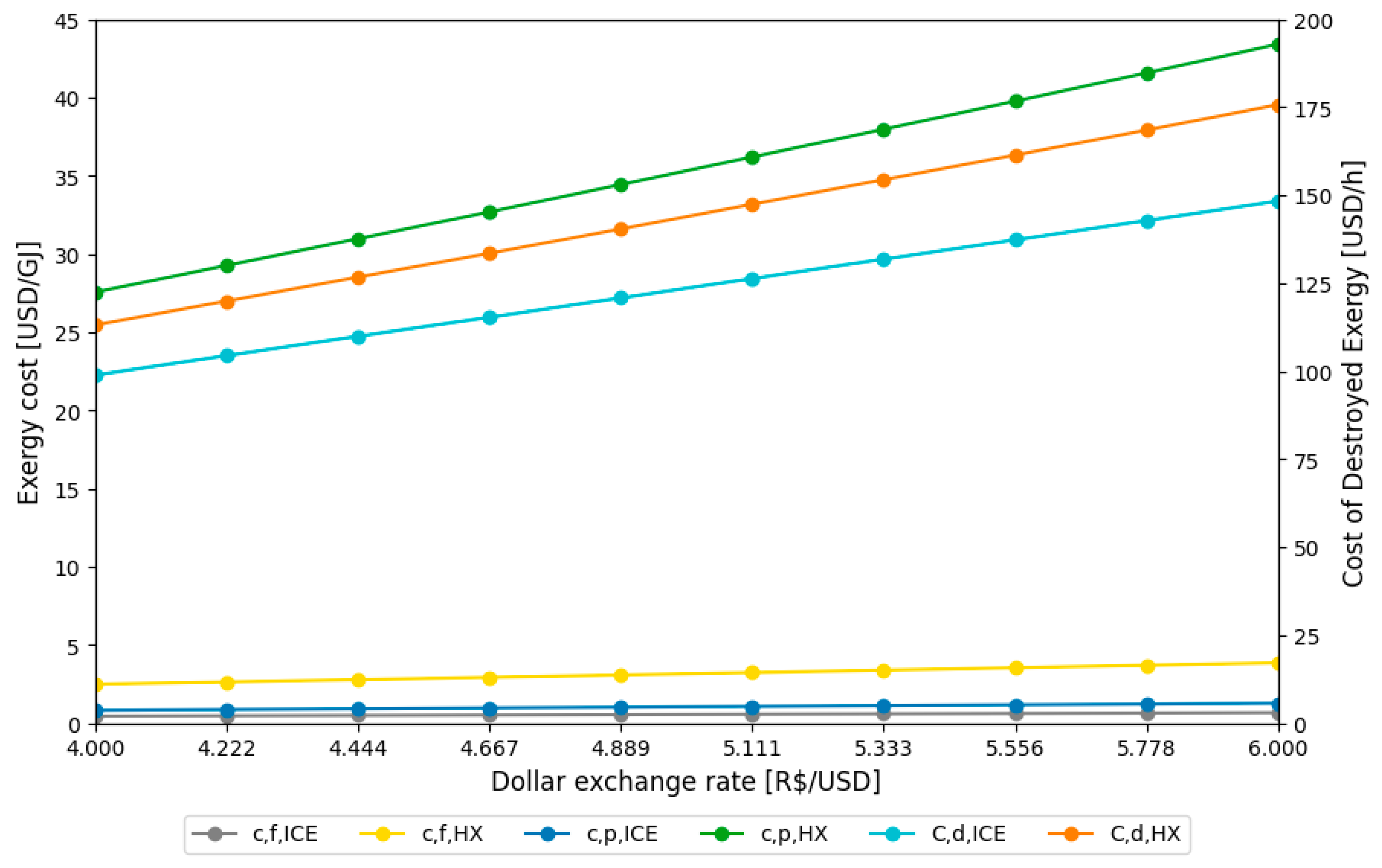 - Fluctuations in the dollar exchange rate (BRL/USD) demonstrated the economic vulnerability of the system. The increase in the exchange rate (from BRL/USD 4.00 to 6.00) raised the exergoeconomic factors fk from 0.13 to 0.18, as capital and O&M costs are susceptible to dollar fluctuations. The most suitable configuration is one with a lower exchange rate (around 4.0) to mitigate the impact of investment costs.