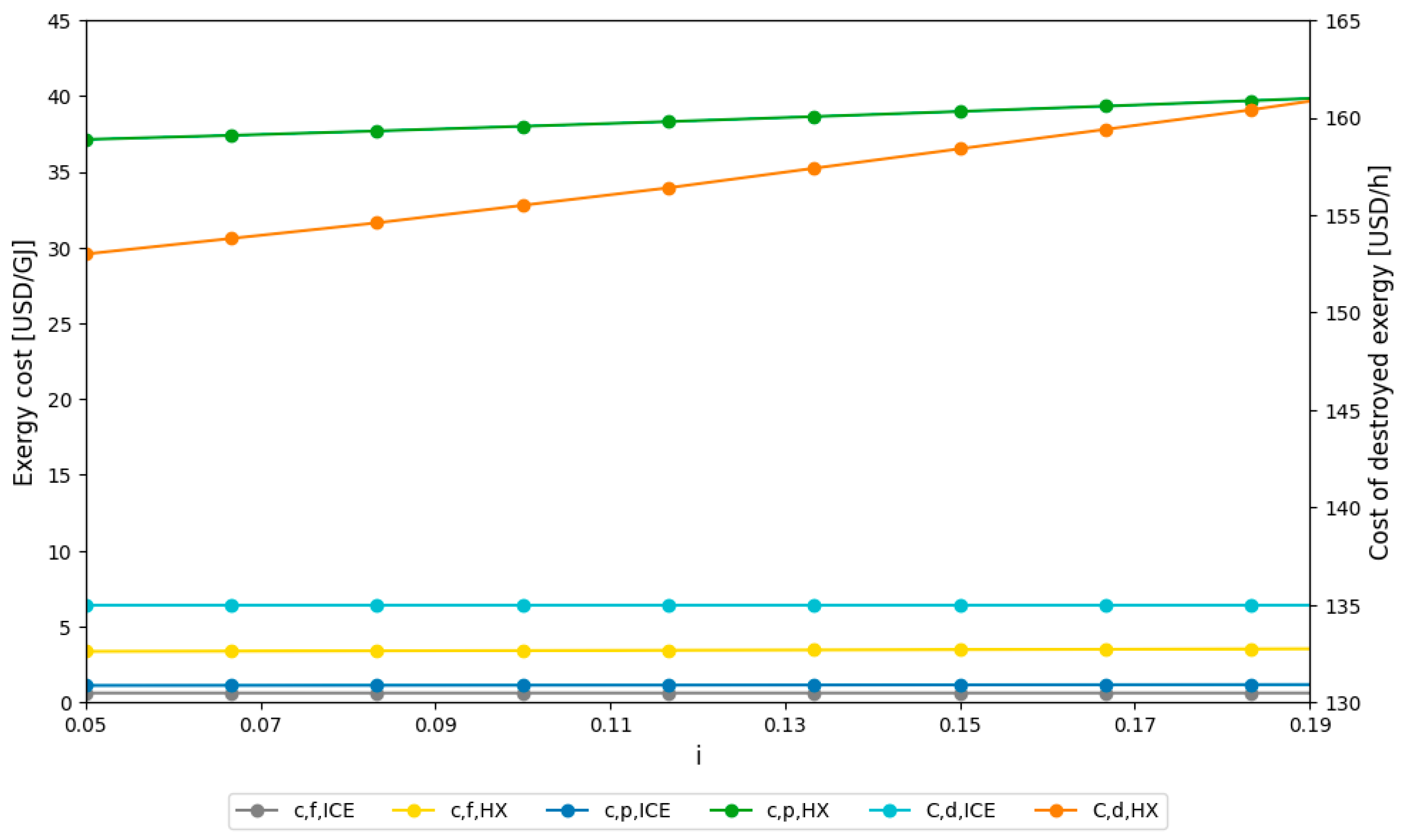 - In reference to the exergoeconomic analysis, the exergy destroyed in the MCI (223.65 kW) was greater than in the HX (45.67 kW); the cost of the exergy destroyed was significantly higher in the HX (USD/h 158.40) than in the ICE.