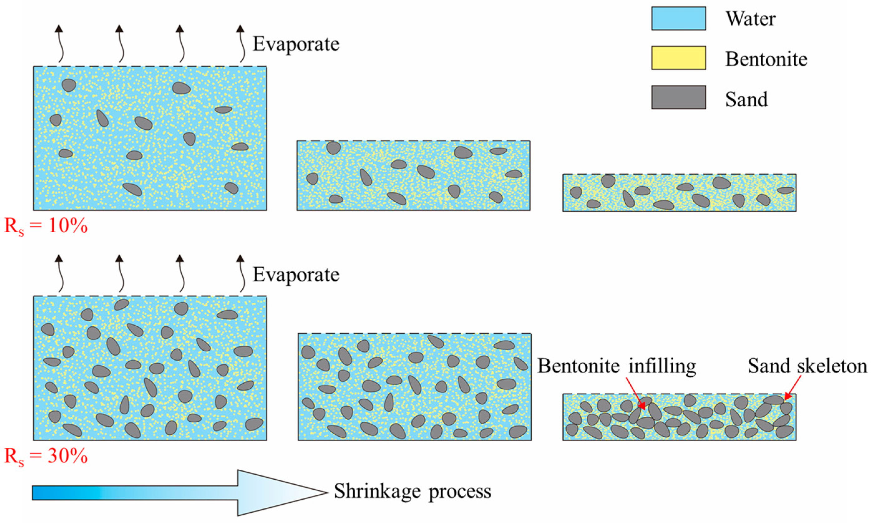 - Zhang, H.; Tan, Y.; Zhu, F.; He, D.; Zhu, J. Shrinkage property of bentonite-sand mixtures as influenced by sand content and water salinity. Constr. Build. Mater. 2019, 224, 78–88. [Google Scholar] [CrossRef]