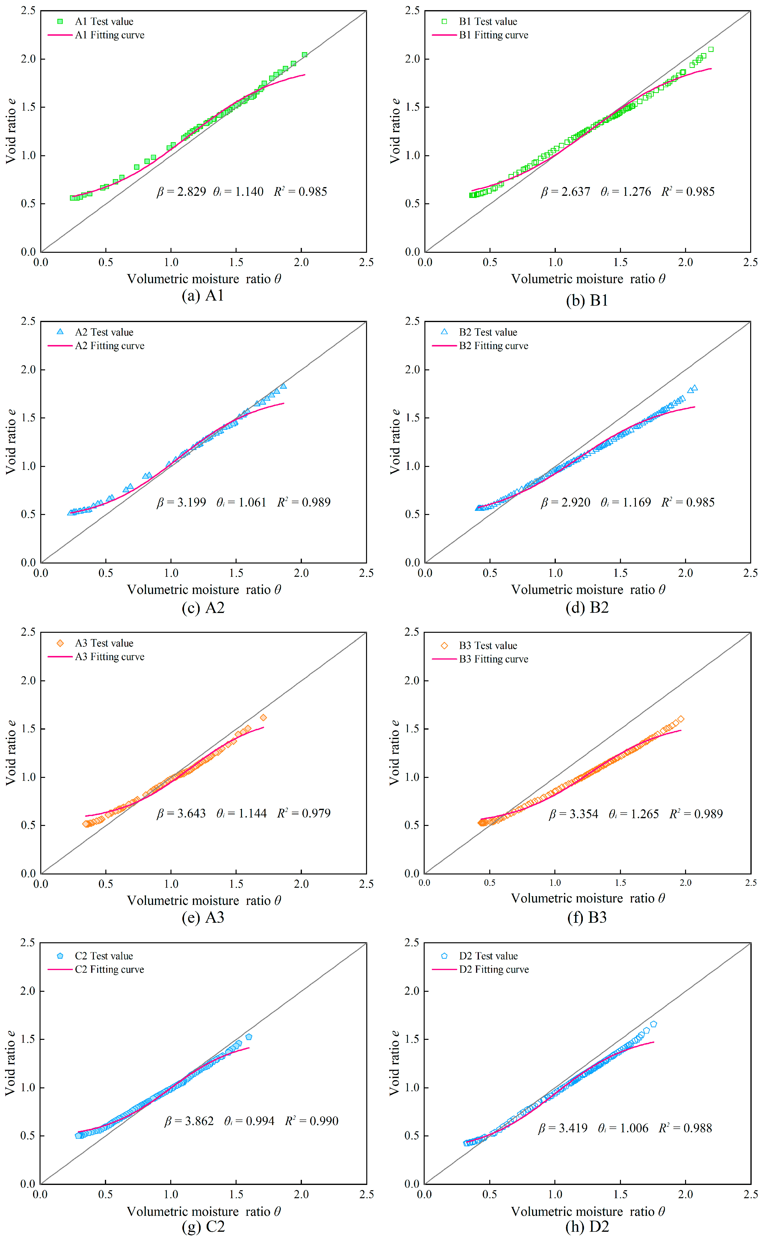 - In this experiment, the measured shrinkage characteristic curves of all samples are fitted with the MCG-B model, and obtain a coefficient of determination of over 97%. This indicates the MCG-B model can empirically describe the shrinkage characteristics of bentonite–sand mixture under the influence of sand additives or the chemical properties of pore water. However, when the sand content is too high, causing the sample to gradually deviate from the clay category, or when the pore water contains crystalline salts, the MCG-B model has certain errors and should be used with caution.