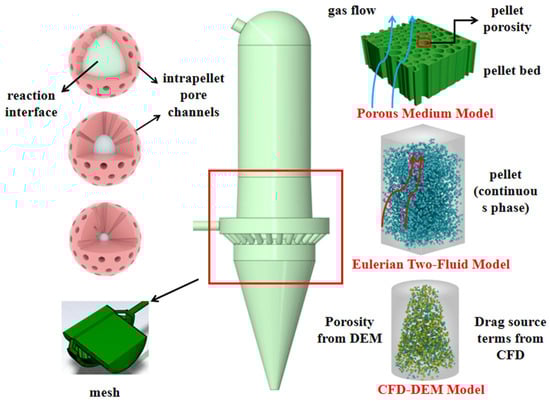 Hydrogen-based shaft furnace reduction is governed by a network of closely coupled phenomena, including gas–solid multiphase flow, heat transfer, multistage reduction reactions, and intra-pellet mass diffusion. Accurately capturing these interactions by numerical simulation is essential for predicting furnace performance, optimizing operating parameters, and informing the design of low-carbon ironmaking processes. Over the past two decades, researchers have progressively integrated gas–solid hydrodynamics, thermal transport, reaction kinetics, and intra-particle diffusion into increasingly sophisticated models of hydrogen-based shaft furnaces. In order to accommodate differing spatial scales, modelling objectives, and computational budgets, several strategies have been developed. As illustrated in Figure 4, three frameworks are now widely employed: (i) porous medium continuum models, (ii) the Eulerian two-fluid (gas–solid) model, and (iii) coupled CFD–DEM approaches.