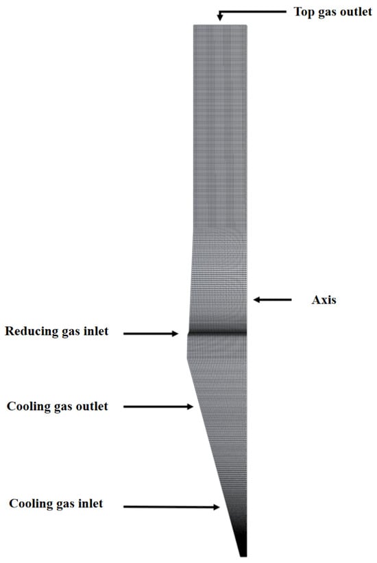 In addition to the above balance equations, a complete porous medium formulation requires appropriate boundary conditions. In most porous medium simulations of shaft furnaces, an axisymmetric geometry is assumed (Figure 5). Pressure outlet boundary conditions are typically imposed at the top of the shaft and at the lower gas off-takes, whereas the inlets for the hot reducing gas and cooling gas are specified as mass flow inlets with predefined temperatures and species compositions. No-slip wall conditions are applied along the refractory lining, coupled with either adiabatic or isothermal thermal boundary conditions, depending on the desired level of detail. Symmetry conditions are enforced along the central axis of the furnace. The solid burden is modelled as a downward-moving porous medium with a specified porosity distribution; its inlet mass flux, temperature, and initial metallization degree at the charging level, as well as the target metallization degree at the discharge, are generally prescribed in accordance with operational practices.