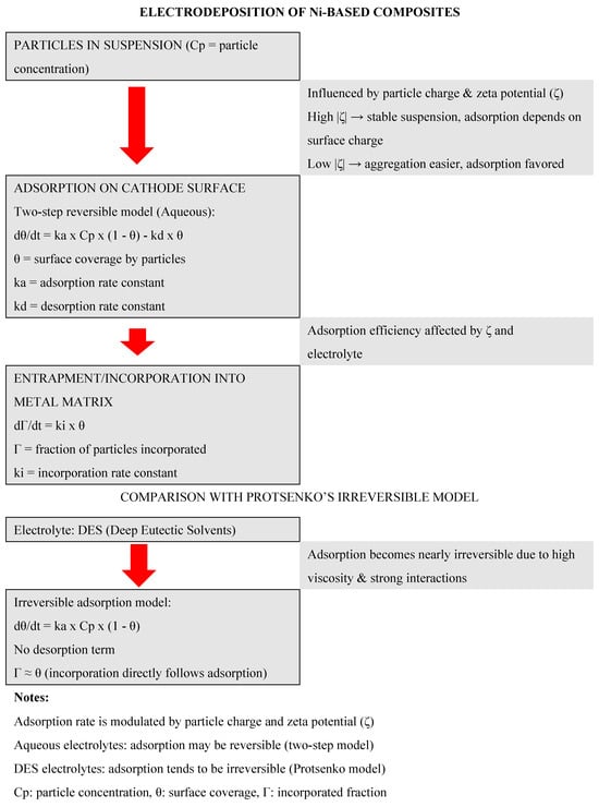 The incorporation of particles into Ni-based composite coatings can be described using mechanistic models that account for adsorption on the cathode surface and subsequent entrapment within the metal matrix. Figure 4 illustrates this process, highlighting the classical two-step reversible adsorption/entrapment model in aqueous electrolytes and the irreversible adsorption model proposed by Protsenko [56] for Deep Eutectic Solvents (DES).