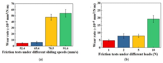 Y. Wang et al. [74] investigated the tribological properties and durability of mold inserts. Molybdenum disulfide (MoS2), tungsten disulfide (WS2), and polytetrafluoroethylene (PTFE) nanoparticles were utilized to electroform nickel-based composite mold inserts. Ni-WS2 mold inserts demonstrated the best lubrication and wear resistance, followed by Ni-PTFE and Ni-MoS2 inserts. While the lowest friction coefficient against the Si3N4 ball decreased to 0.25, the maximum micro-hardness of Ni-WS2 mold inserts improved from 278.2 HV for pure Ni to 456.0 HV, an increase of 1.64 times. Self-lubrication and wear resistance were affected more by increasing sliding speed than by external load. The wear rate roughly tenfold increased when the sliding speed was above 65.4 mm/s (Figure 6a). High tangential friction and high normal pressure resulted in rapid wear of the composite mold inserts and loss of their self-lubricating qualities when the maximum sliding speed and load were exceeded. As the applied load increased from 1 N to 10 N, the wear rate gradually increased. It was possible to maintain the self-lubricating qualities of the Ni-WS2 mold inserts while reducing their wear rate when the external load was less than 10 N. Under a 10 N load, the wear rate increased significantly, although it was still lower than that of pure Ni (Figure 6b). Nevertheless, the increase in sliding speed had a greater impact on self-lubrication than the external stress.