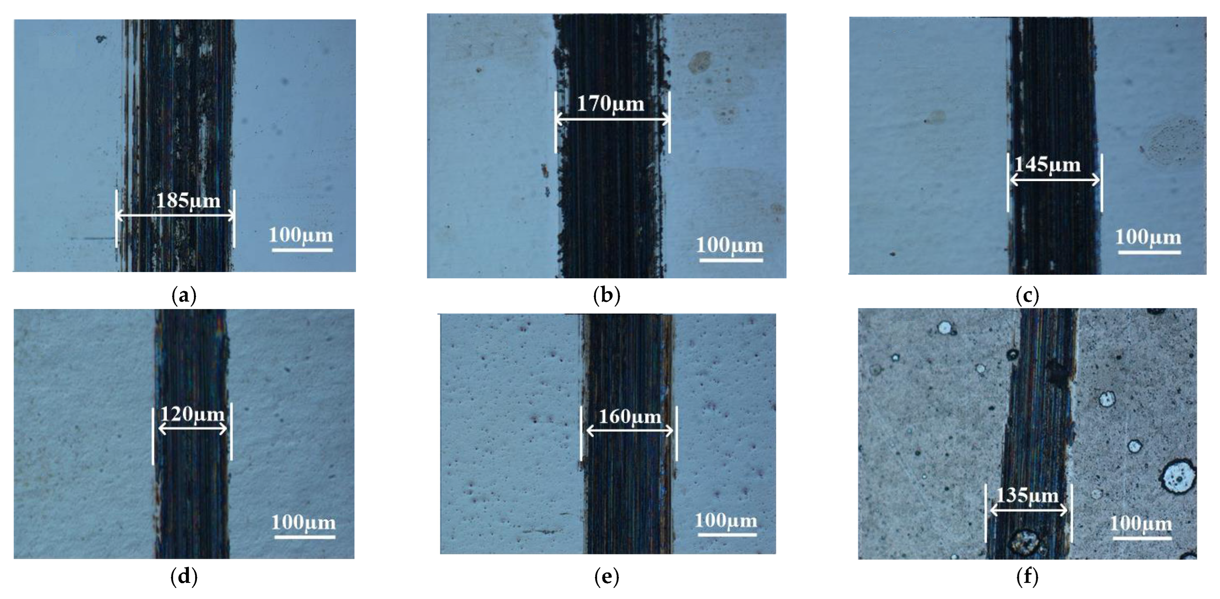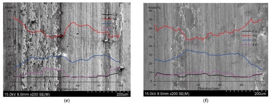 The SEM morphologies of the coatings’ worn scratches are shown in Figure 9 to further illuminate the coatings’ wear behaviors. All of the coatings have evident furrows in their worn scratches, which suggests that the coatings wear abrasively. Additionally, there was some avulsion at the side and inside the scratches, which suggests sticky wear behavior. In particular, the avulsion happened along the side of the coatings’ scratches made at 1 and 4 g/L, which caused the coatings’ scratch profiles. In the meantime, CoF fluctuated due to the coatings’ varied wear behaviors.