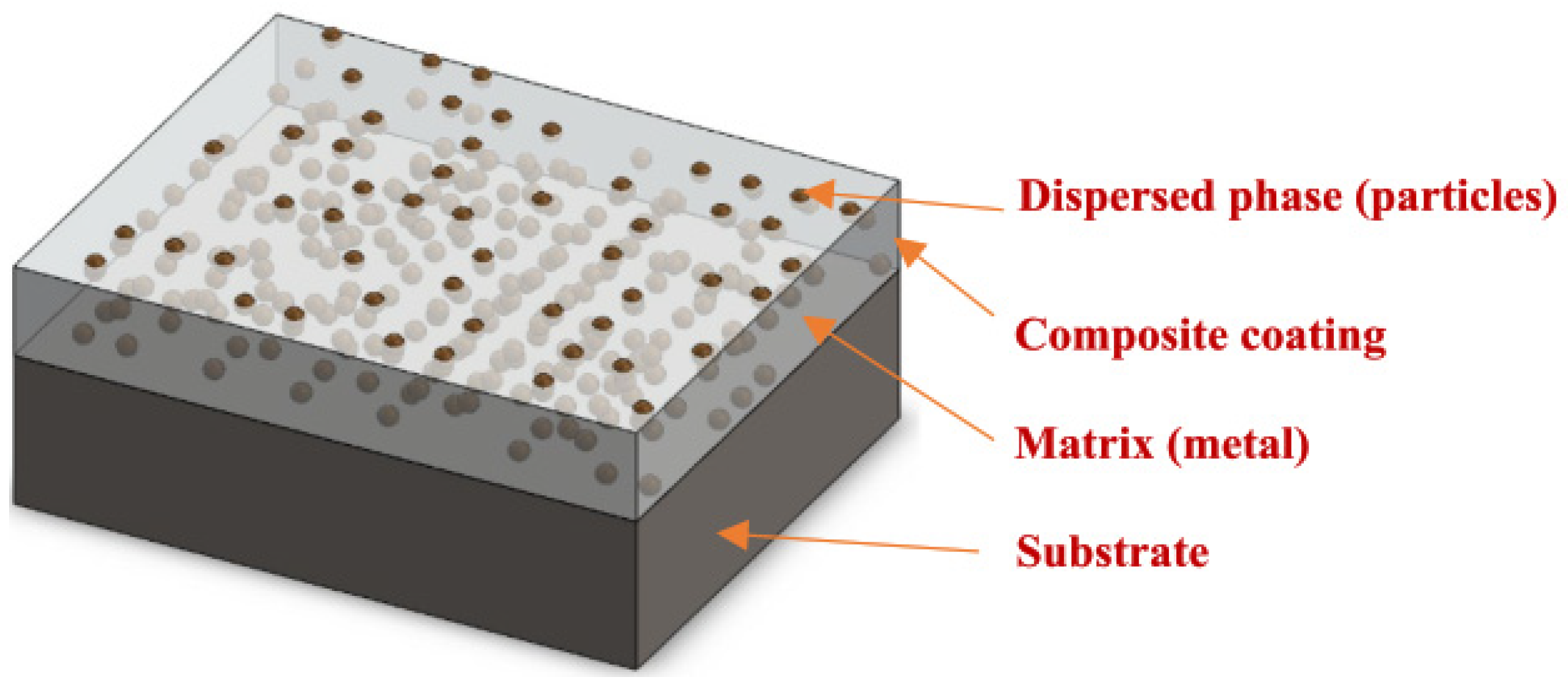 During electrodeposition, nickel ions dissolved in the electrolyte migrate from the anode to the cathode, where they are reduced to form the metallic deposit. When negatively charged second-phase particles approach the cathode, they adsorb nickel ions and are incorporated into the growing deposit, resulting in the formation of a metal matrix composite (MMC) coating. The characteristics of the final composite can be tailored by adjusting the electrodeposition parameters to control the incorporation rate of the particles, their dispersion within the matrix, and their influence on grain refinement of the metallic microstructure. Additionally, self-lubricating particles may be introduced to reduce wear by imparting intrinsic lubricating properties to the composite coating, thereby decreasing friction and improving tribological performance [11].
