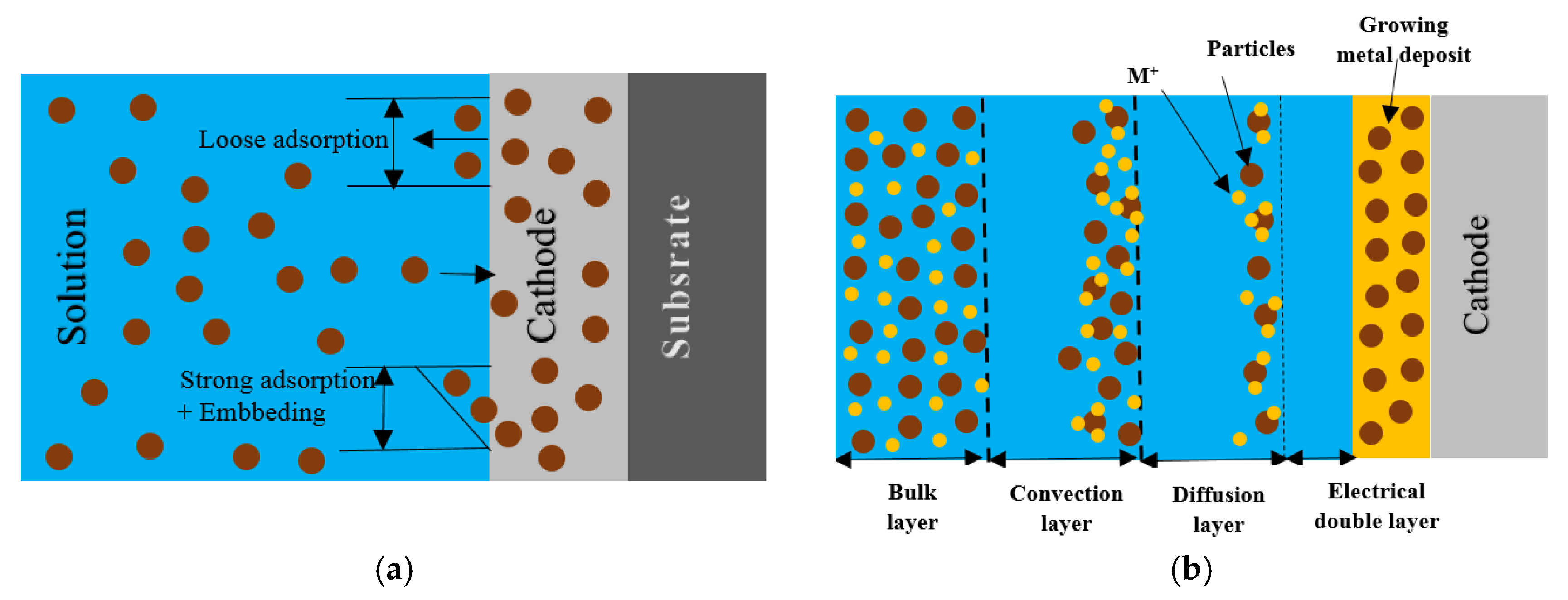 Schematic (a) the process of co-deposition according to the Guglielmi model and (b) procedure for co-electrodepositing unsolvable particles into a developing metal matrix to form a metal composite covering.