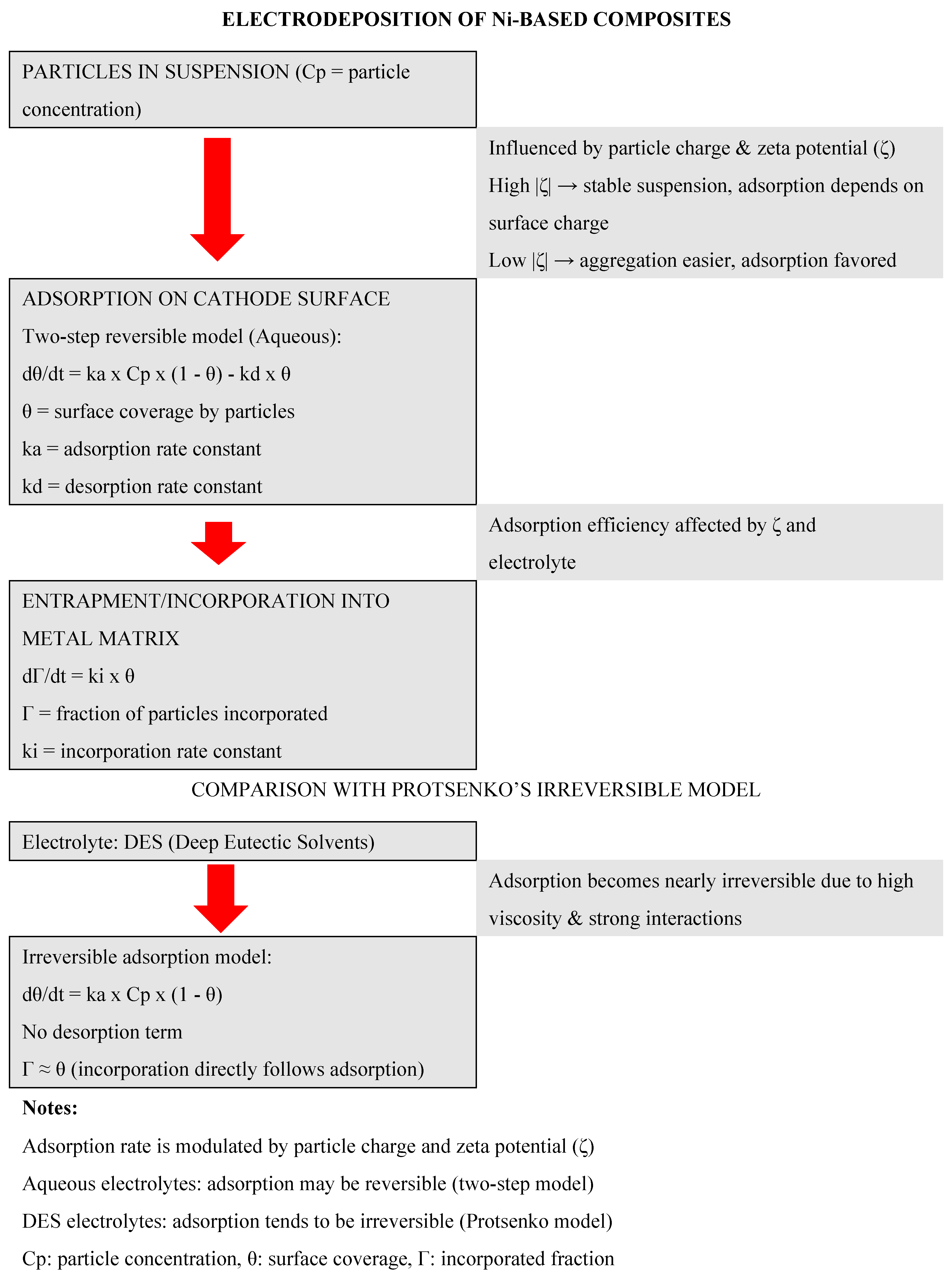 Mechanistic illustration of particle incorporation in Ni-based composite coatings. In aqueous electrolytes, a two-step reversible model is used: adsorption of particles on the cathode surface (dθ/dt = ka Cp(1 − θ) − kdθ) followed by entrapment/incorporation (dΓ/dt = kiθ). The particle charge and zeta potential (ζ) influence adsorption efficiency. In DES, adsorption tends to be irreversible (Protsenko model: dθ/dt = kaCp(1 − θ)), with direct incorporation into the metal matrix.
